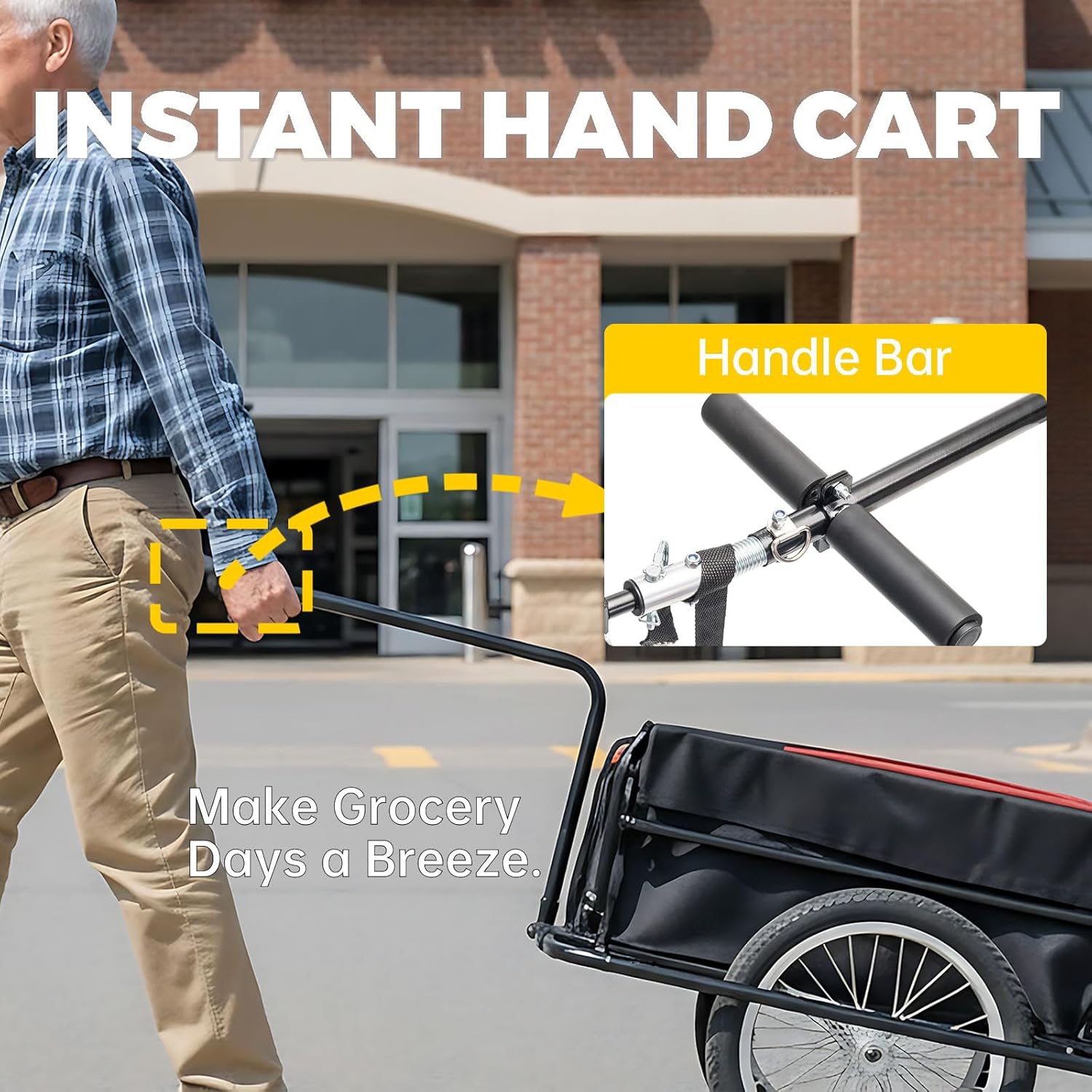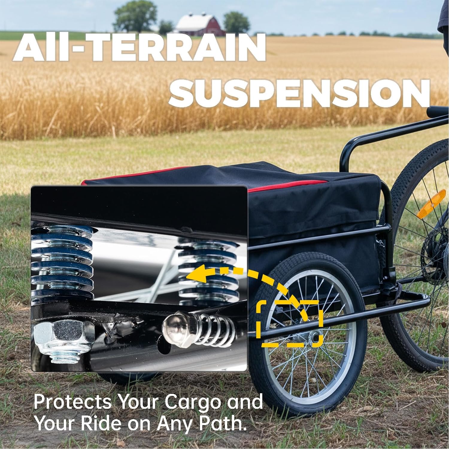 2-in-1 Bike Trailer & Pull Cart, All-Terrain Suspension w/ Quick-Connect Hitch & Weather Shield | Multi-Use Cargo Hauler for Groceries, Family Picnics, Beach & Farm | Eco-Friendly Urban Transport🚲 2-IN-1 BIKE TRAILER & INSTANT PULL CARTStop struggling with heavy bags! Convert this versatile hauler from a secure bike trailer to a nimble hand cart in seconds—no tools needed. Perfect for grocery stores, farmers' markets, or family adventures at the park and beach.🛡️ ALL-TERRAIN SUSPENSION & ANTI-TIP STABILITYConquer bumpy roads with confidence! Our advanced suspension system absorbs shocks on grass, gravel, or uneven urban paths, while the one-kick stabilizer leg ensures a rock-solid, tip-free platform for safe and easy loading every time.⛈️ FULL-WEATHER COVER & QUICK-CONNECT SECURITYYour cargo stays protected, rain or shine! The detachable, heavy-duty weather shield provides complete coverage. Paired with our intuitive quick-connect bike hitch, you get a locked-in, wobble-free ride and total peace of mind on every journey.♻️ ECO-FRIENDLY & SPACE-SAVING DESIGNMake a green choice without compromise! Replace short car trips and reduce your carbon footprint. When not in use, the fold-flat design and compact footprint make storage in your garage or apartment closet a breeze.🏆 PREMIUM CONSTRUCTION Built to last a lifetime of adventures! We use reinforced, lightweight yet high-strength materials and meticulous craftsmanship. Backed by our reliable customer service, your satisfaction is 100% guaranteed.