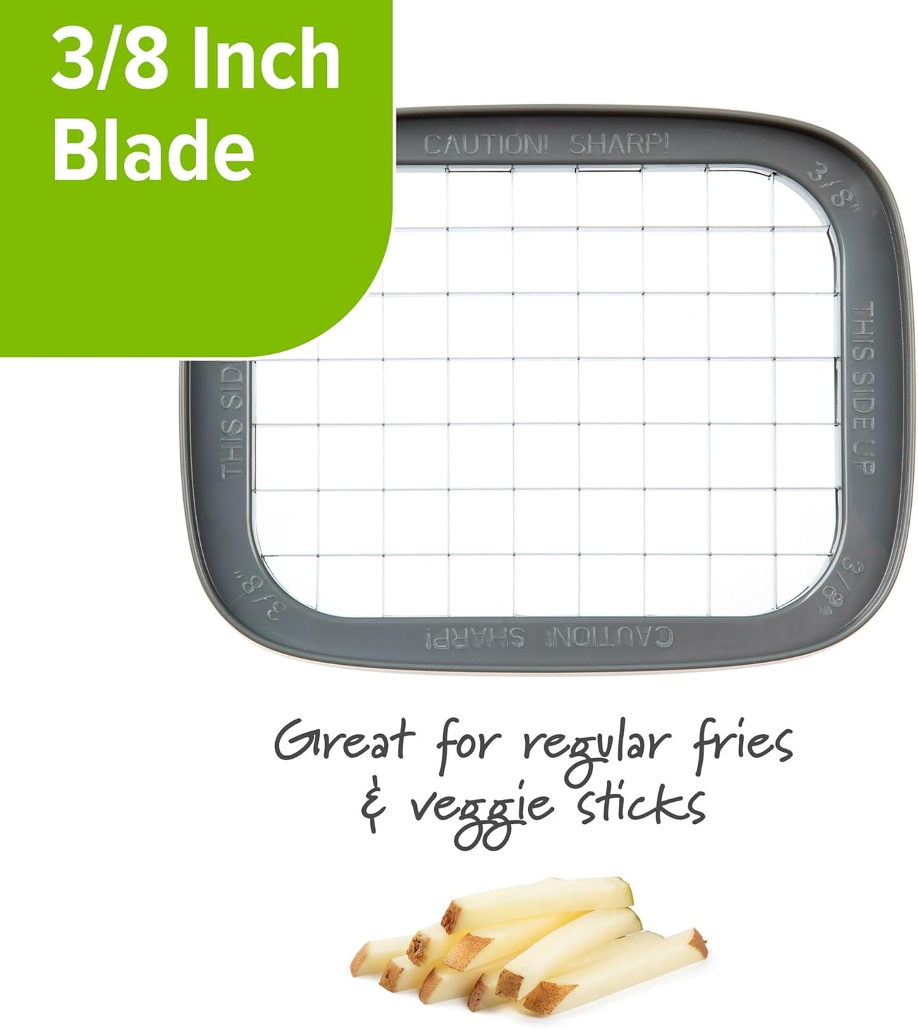 Product details Chop, dice and wedge in seconds with the Deluxe French Fry Cutter! In one quick motion, easily cut french fries or vegetable sticks for the air fryer or baked in the oven. The 1/4 inch blade is perfect for making matchstick fries, thin vegetable sticks and fine chopping. The 3/8 inch blade is great for regular fries, vegetable sticks and coarse chopping. The 8 Wedge blade is ideal for slicing potato, citrus and apple wedges. The Deluxe French Fry Cutter is available in clear, measures 3.75" W x 4.75" D x 5.80" H and weighs 1.16 lbs. With removable blade inserts, a handy cleaning comb, and a dishwasher safe design, cleanup is quick and easy. Chop, dice and wedge in seconds with the Deluxe French Fry Cutter 1/4 inch blade is perfect for matchstick fries, thin vegetable sticks and fine chopping 3/8 inch blade is great for regular fries, vegetable sticks and coarse chopping 8 Wedge blade is ideal for slicing potato, citrus and apple wedges Item measures 3.75" W x 4.75" D x 5.80" H and weighs 1.16 lbs Dishwasher Safe and includes a cleaning comb for easy cleanup
