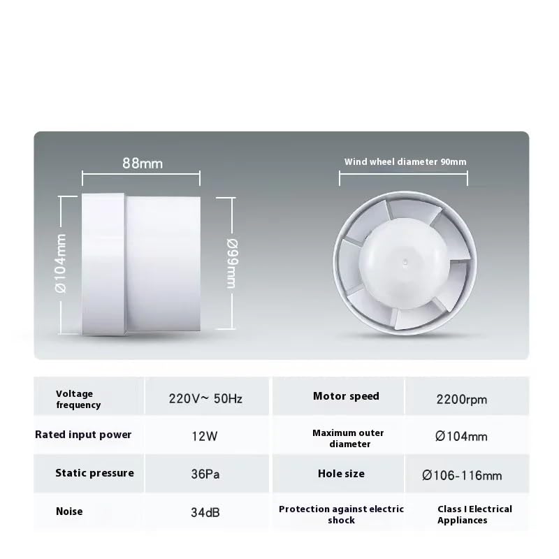 Exhaust Fans100mm/3.93" Duct Fan Depth: Approx. 88mm/3.46",125mm/5 inch ventilator features:Color: WhiteMaterial: ABS (Acrylonitrile Butadiene Styrene) + CopperShape: RoundVoltage: 220V, 50HzNoise: 34dBFan speed: 2200rpmPower: 16WHole diameter: approx. 125 cm/4.92 inchesAir volume: 240m3/H125mm/4.92" Duct Fan Depth: Approx. 88mm/3.46",150mm/6-inch ventilator features:Color: WhiteMaterial: ABS (Acrylonitrile Butadiene Styrene) + CopperShape: RoundVoltage: 220V, 50HzNoise: 30-35dbFan speed: 2000rpmPower: 18WAperture: Approx. 320m/5.9 inchesAir volume: 320m3/H150mm/5.9" Duct Fan Depth: Approx. 108mm/4.25"