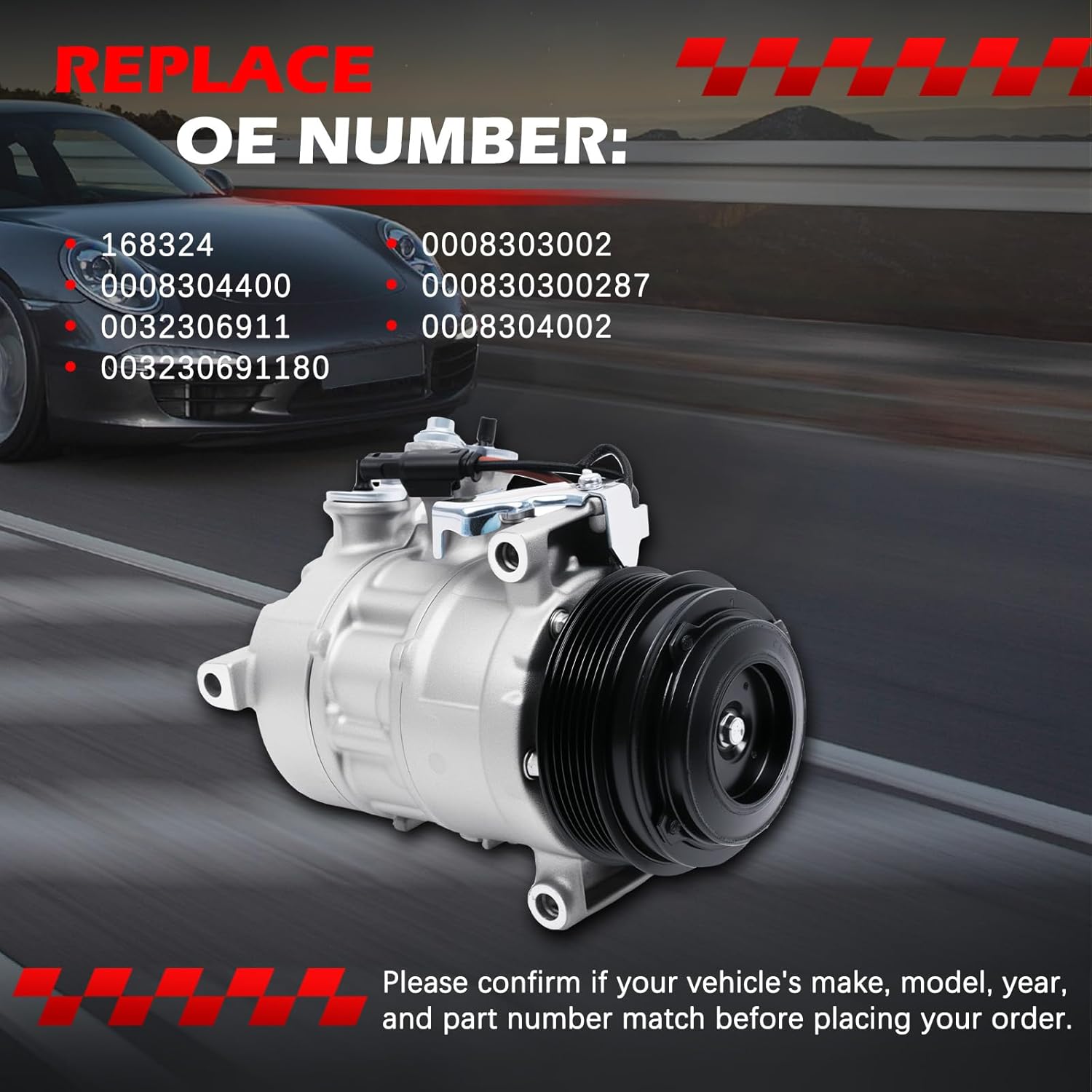 OE Part Number:168324, 0008304400, 0032306911, 003230691180, 0008303002, 000830300287, 0008304002Application:For E200 2017-2020 L4 2.0LFor E250 2017-2019 L4 2.0LFor E300 2017-2020 L4 2.0LFor E350 2020-2022 L4 2.0LFor E400 2018 V6 3.0LFor E43 AMG 2018 V6 3.0LFor E450 2019-2020 V6 3.0LFor E53 AMG 2019-2020 L6 3.0LFor E63 AMG S 2018-2020 V8 4.0LFor C250 2015-2018 L4 2.0LFor C300 2015-2021 L4 2.0LFor C350e 2018 L4 2.0LFor C43 AMG 2017 V6 3.0LFor C43 AMG 2018-2021 V6 3.0LFor C63 AMG 2018-2021 V8 4.0LFor C63 AMG S 2018-2021 V8 4.0LFor GLC250 2018 L4 2.0LFor GLC300 2016-2022 L4 2.0LFor GLC350e 2018-2020 L4 2.0LFor GLC43 AMG 2017-2022 V6 3.0LFor GLC63 AMG 2019-2020 V8 4.0LFor GLC63 AMG S 2019-2020 V8 4.0LFor SLC300 2017-2020 L4 2.0LFor SLC43 AMG 2017-2020 V6 3.0LFor SLK300 2016 L4 2.0LFor Metris 2016-2021 L4 2.0LFor Z4 2010 L6 3.0LFor Z4 2011 L6 3.0LSpecifications:①Compressor Style: 6SAS14C②Pulley Groove Quantity: 6③Pre-filled with Oil: Yes(No oil is needed for first use; adding too much may damage the product)④Clutch Included in Package: Yes⑤Compressor Type: Belt Driven⑥Fitment Type: Direct ReplacementNote:Please check that the model number and part number match before ordering.