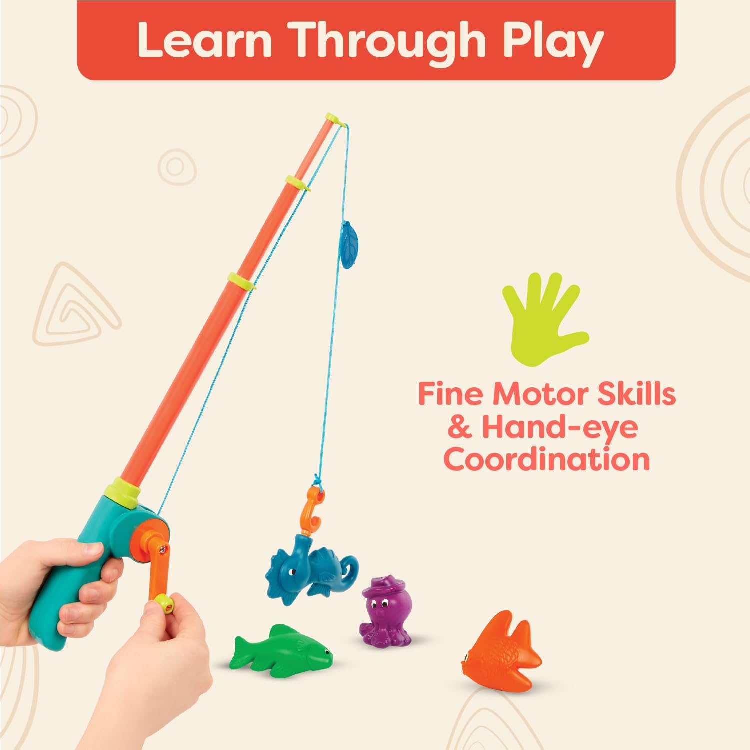 Fishing fun is at your fingertips with the Little Fisher’s Kit from B. toys! This colorful play set has everything kids need to learn more about fishing – solo or with a buddy. The kit comes with 2 fishing poles, 8 sea animals, and 1 storage bag to grab these toys on-the-go. Children can easily practice fishing at home, in the bathtub or at the pool by holding the tiny hands-friendly reel and catching the fish, octopuses, or seahorses with the magnetic line. Not to mention, fishing with these pretend play toys can also improve hand-eye coordination and develop both gross and fine motor skills. And because we at B. keep the environment in mind, parents will also be happy to know that our packaging is 100% recyclable! Recommended for kids 3 years and over.