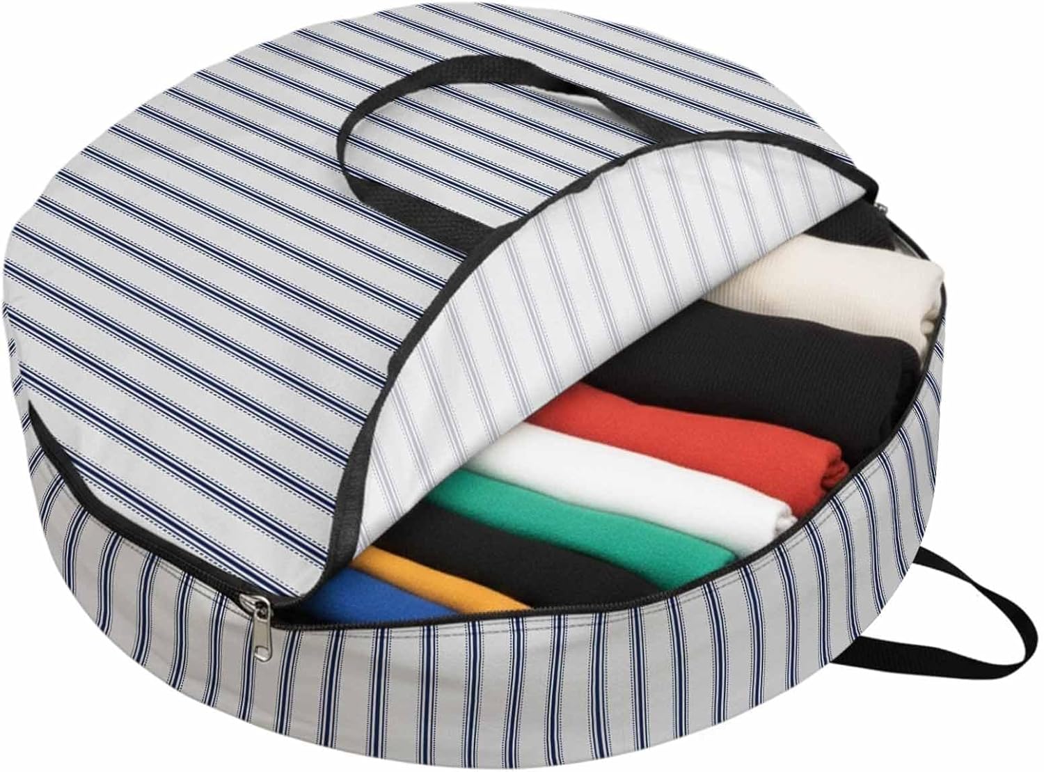Reclaim Your Closet Space with the Round Storage Solution! Material: polyester Diameters: 24 inch, 30 inch, 36 inch Depth: 7 inches Package Includes: Round Storage Bag One Bag, Endless Possibilities: Whether you are swapping out your summer wardrobe, moving into a new dorm, or packing away holiday decorations, this bag has you covered. The circular design is uniquely suited for: Bedding: Comforters, quilts, sheet sets, and oversized pillows. Clothing: Winter coats, sweaters, and bulky ski gear. Home Decor: Holiday wreaths, garlands, and floral arrangements. Outdoor Gear: Camping blankets, sleeping bags, and beach towels. Dual Zippers: The high quality double zipper design allows the closet organizer to open wide from both sides, making it effortless to load and unload even the bulkiest comforters or wreaths. Reinforced Handles: Sturdy, reinforced handles are securely stitched to provide extra strength and a comfortable grip when carrying heavy loads or pulling the bag from under a bed. Clear Label Pocket: A transparent built-in label holder allows you to quickly identify the contents of each bag without ever having to unzip it, keeping your storage perfectly organized.