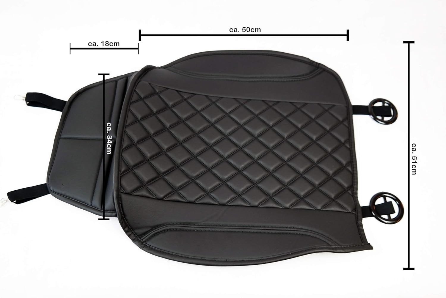 Faux leather quilted pattern seat cover. The seat cover has two front pockets where you can store various items such as a wallet, vehicle registration certificate or smartphone. Quality product made by Bremer seat covers. More than 10 years experience in manufacturing seat covers. Package includes: 1 seat cover in faux leather in the selected colour. Easy to install. Two plastic discs on rubber bands are pulled through between the backrest and the seat, which then fix the cushion on the back and prevent slipping. At the front end of the seat, two rubber bands with hooks are hooked under the seat on the frame.