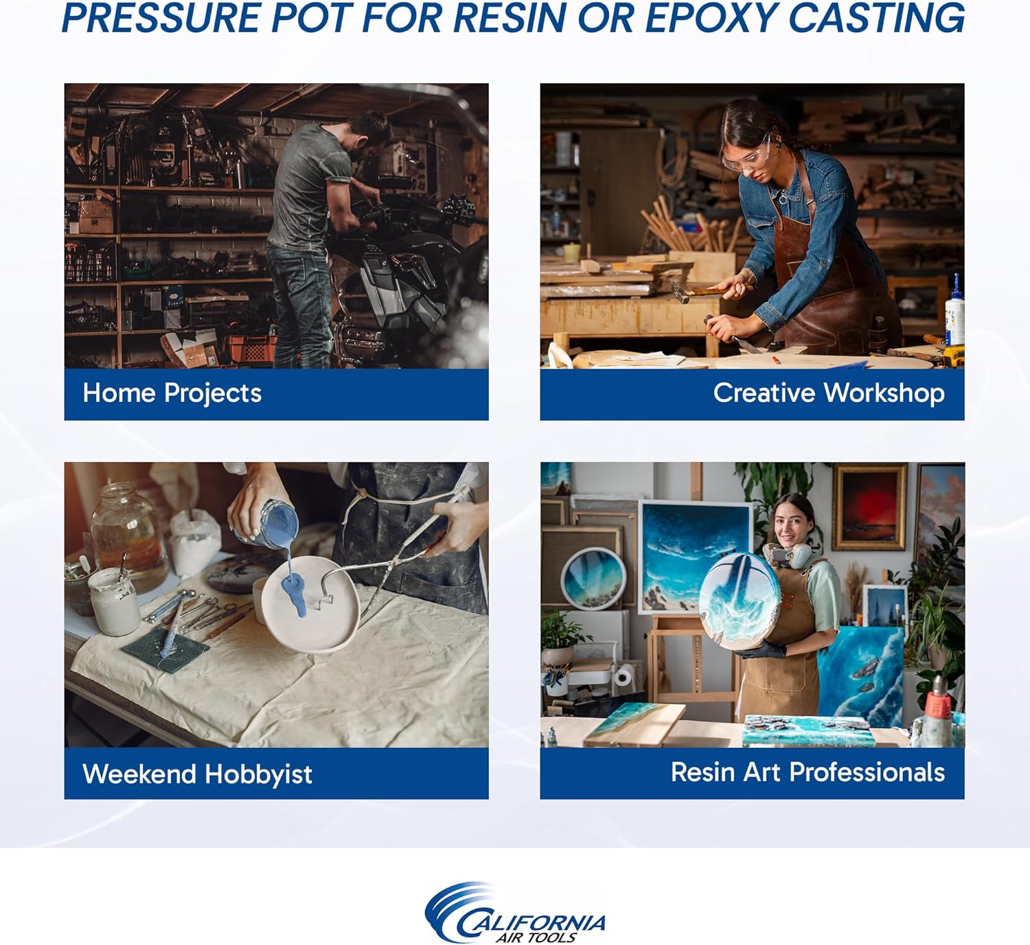 The California Air Tools Pressure Pot for Resin Casting is your go-to solution for reliable and efficient casting projects. With its robust coated steel tank, this pressure pot ensures easy clean-up after each use, making maintenance a breeze. The durable construction guarantees long-lasting performance, making it an essential tool for any workspace. Whether you're a professional or a hobbyist, this epoxy resin pressure pot is designed to meet your casting needs with ease and efficiency. Stability and control are crucial when working on casting projects, and the California Air Tools pressure chamber for casting delivers on both fronts. The pressure pot is equipped with rubber feet for stationary stability and includes wheels (castors) for easy mobility. The included input connector, regulator, on/off ball valve, and pressure relief valve provide precise control over the casting process, ensuring safe and efficient operation every time. Designed with convenience in mind, the California Air Tools pressure pot for epoxy resin casting features an easy-to-carry handle, making it effortless to transport and use in different locations. With a maximum pressure of 80 PSI and an operating pressure of 60 PSI, it is ideal for a wide range of casting applications. At California Air Tools, we pride ourselves on delivering innovative, top-tier technology in air compressors that meet the needs of both professionals and hobbyists without compromising on power or user-friendliness. Experience the ultimate in casting convenience and efficiency with the California Air Tools Pressure Pot for Resin Casting. Its robust design, precise control, and portability make it the perfect tool for all your casting projects.