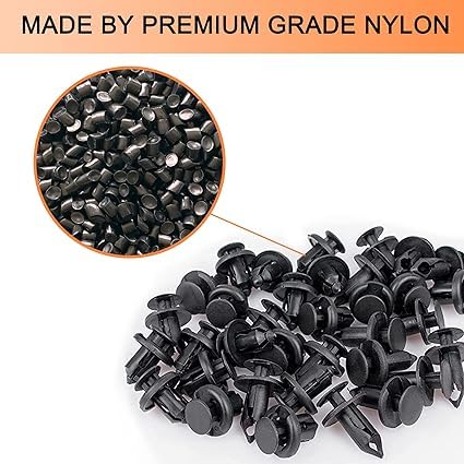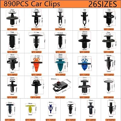 Car Push Retainer Clips & Auto Fasteners Assortment Material: Nylon Packing List: 890 PCS/26 Sizes most Popular plastic rivets 1PC metallic stainless steel fastener clips removal tool 4PCS plastic car trim removal tools 50PCS Sponge cushions 5PCS Short plastic cable ties 5PCS Long plastic cable ties Compatible with Chevrolet, Lexus, Toyota, Honda, Acura, Mitsubishi, Audi, Chrysler, Dodge, Ford, Jeep, Saturn, VW, Honda, better replacement for original fender or bumper clips. Note:Please check the size, type and shape in the pictures to make sure the clips looks identical to your original one.Extruded U-nuts and body bolts Hardware Kit Direct replacement and perfect fitment Well made engine under cover splash shield body bolts screws kit fender bumper clips rivets. They fit well to fender liner and connecting components too. You can use this kit to replace your stock kit or repair the stock splash guard.