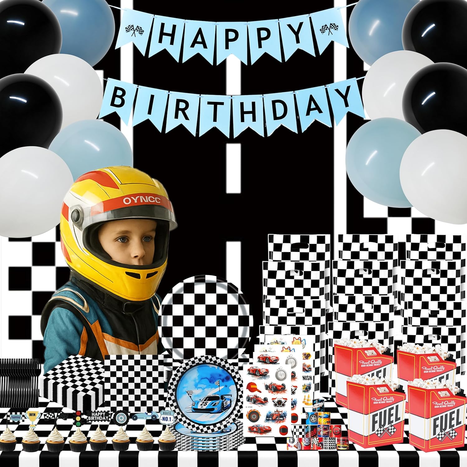 | Included Components | 20 7-inch plates, 25 napkins, 20 bamboo forks, 1 balloon pump, 52 balloons (12"/5"), 2 checkered balloons (18"), 1 tire balloon (26"), 1 Happy Birthday banner (12 ft), 1 cake topper, 1 instruction guide, 1 balloon strip (16.5'), 100 glue dots, 32.5' ribbon |