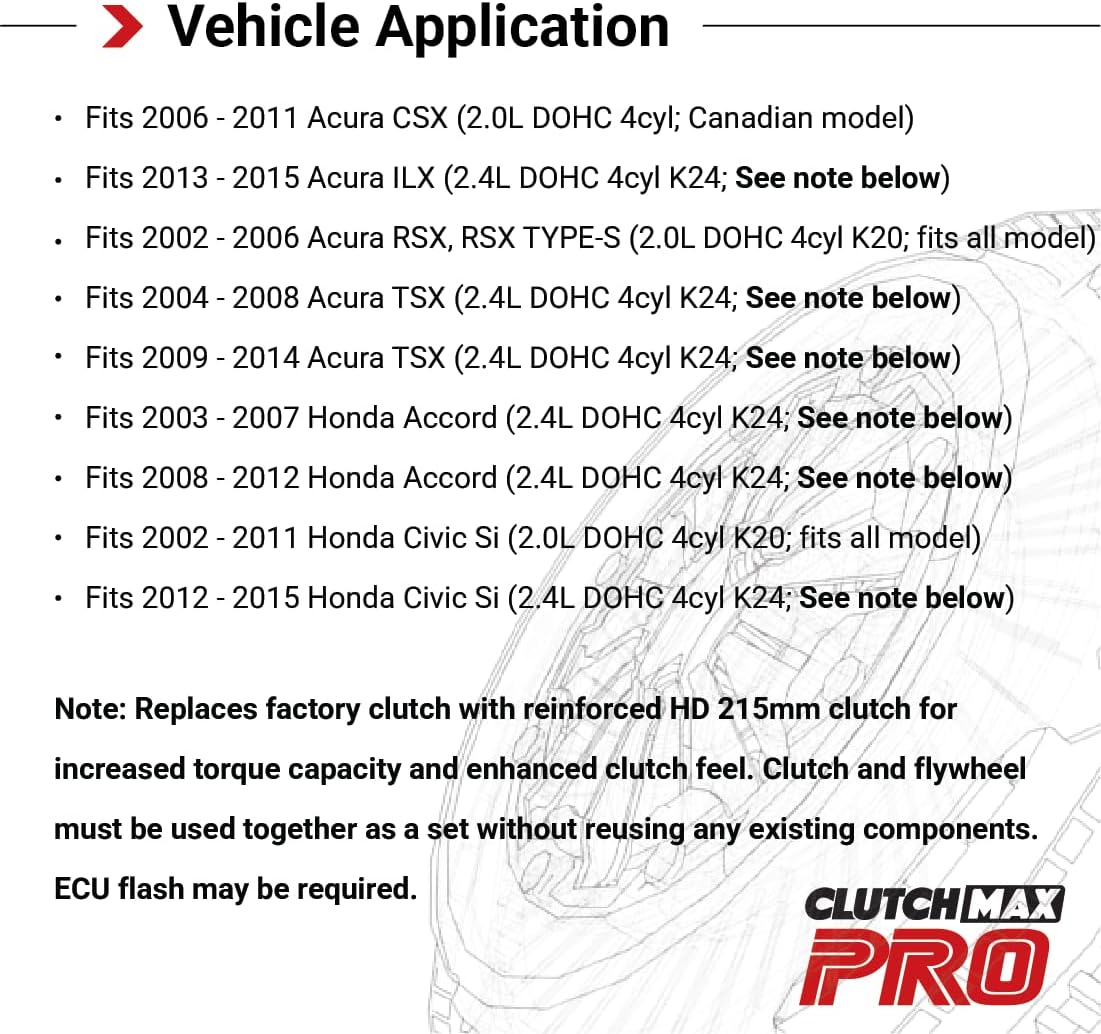 Vehicle Application Fits 2006 - 2011 CSX (2.0L DOHC 4cyl; Canadian model)Fits 2013 - 2015 ILX (2.4L DOHC 4cyl K24; See note below)Fits 2002 - 2006 RSX, RSX TYPE-S (2.0L DOHC 4cyl K20; fits all model)Fits 2004 - 2008 TSX (2.4L DOHC 4cyl K24; See note below)Fits 2009 - 2014 TSX (2.4L DOHC 4cyl K24; See note below)Fits 2003 - 2007 Honda Accord (2.4L DOHC 4cyl K24; See note below)Fits 2008 - 2012 Honda Accord (2.4L DOHC 4cyl K24; See note below)Fits 2002 - 2011 Honda Civic Si (2.0L DOHC 4cyl K20; fits all model)Fits 2012 - 2015 Honda Civic Si (2.4L DOHC 4cyl K24; See note below)Note: Replaces factory clutch with reinforced HD 215mm clutch for increased torque capacity and enhanced clutch feel. Clutch and flywheel must be used together as a set without reusing any existing components. ECU flash may be required. About ClutchMax PRO ClutchMax PRO® has 20+ years of history supplying very best clutch products to top tier clutch brands in Japan, UK, Australia and U.S. ClutchMax PRO® has taken this experience and a new approach to re-engineer performance clutch industry and is now one of the fastest growing performance clutch company in the world. ClutchMax PRO® contributes this growth to its commitment in the innovation and highest quality of the products that we design and manufacture, complimented by an industry leading warranty and unparalleled customer service. Compatible model and year list Please enter your Year, Make and Model above using Amazon’s ‘My Garage’ tool - the tool will specify which clutch kit fits your vehicle Questions or Concerns? If you have any questions/concerns, message us using Amazon’s ‘contact seller’ form. We respond to all messages within 24 hours.