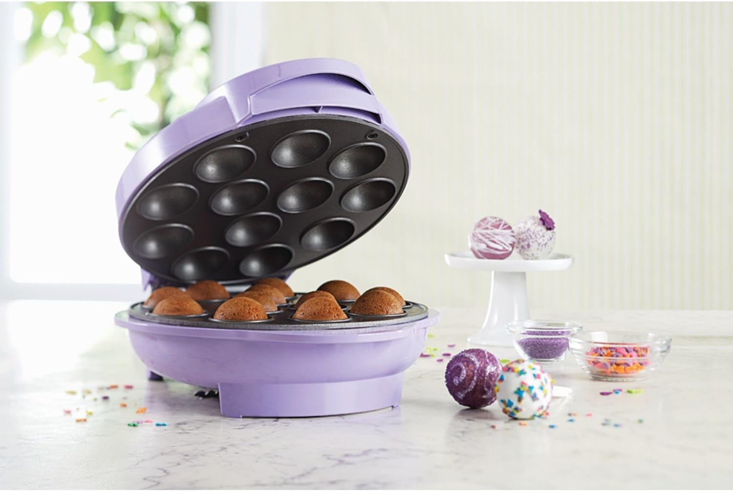 Create fun, bite-sized treats in minutes with this electric cake pop maker in vibrant purple. Perfect for baking up to 12 cake pops or doughnut holes at a time, it features a nonstick cooking surface for easy release and fast cleanup. With simple power and ready indicator lights, a cool-touch locking handle, and compact cord storage, it’s a convenient and family-friendly way to whip up delicious desserts for birthdays, holidays, or everyday fun. The included manual also provides helpful baking tips and creative recipe ideas to inspire your next sweet creation.