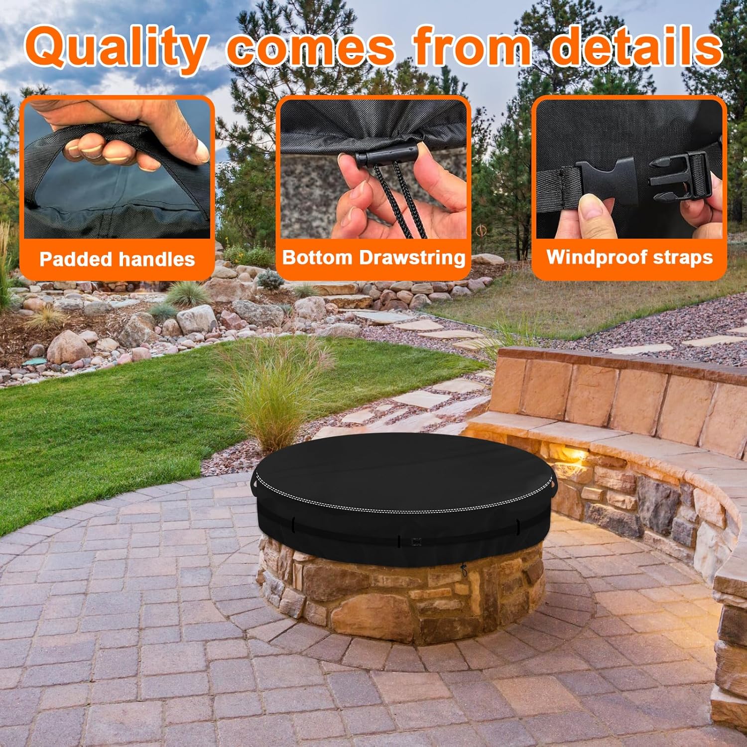 Fire Pit Cover Round for In Ground Firepit, Waterproof Dustproof 600D Heavy DutyRound Fire Pit Cover for 52-57 Inch Built In Stone Fire Pits, Snow Rain Wind and Sun Weather