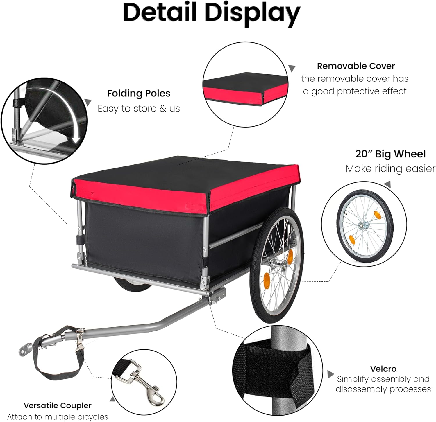 Imagine this: It's Saturday morning, the sun is warm, and you're heading to the farmers' market. Your kids are laughing behind you in the bike trailer for kids, their faces peeking out as they enjoy the ride. On the way back, you load up fresh produce, a baguette, and even a potted plant into your bike cargo trailer—no sweat, no car, no parking hassles. Whether you're using it as a bike wagon for weekend adventures or a utility bike cart for daily errands, this trailer transforms your bicycle into a human-powered pickup truck.You'll love how effortlessly it becomes part of your lifestyle. Need to haul tools to the community garden? Done. Taking your pup to the park in a bicycle sidecar setup? Easy. Planning a camping trip and need a bicycle camper trailer for your gear? This is it. With its 120 lbs capacity and spacious 55" x 30" x 25.5" cargo area, you'll wonder how you ever biked without it.Built Strong: Haul Up to 120 lbs with ConfidenceThe foundation of this bike trailer is a heavy-duty frame crafted from high-quality iron plates and steel pipes. It's not just strong—it's built to last. The steel tubes feature an anti-rust powder coating and are expertly welded at every joint, ensuring this bike trailer cargo hauler withstands years of use. Whether you're loading up bike storage bins or hauling camping equipment, you can trust the durability. Perfect as an ebike trailer or for traditional bicycles.Universal Compatibility: Fits Your Bike, Protects Your GearWorried about whether it will fit your bike? Don't be. The universal coupler attaches securely to most bicycles—including e bike trailer setups, mountain bikes, and cruisers. Plus, the fully removable 600D Oxford cloth cover provides serious weather protection. Rain or shine, your cargo stays dry and clean. It's like having a go cart for adults that follows you everywhere, keeping your belongings safe from the elements.20" Pneumatic Wheels: Smooth Ride, Better ControlBigger wheels mean a better ride. These 20-inch inflatable tires absorb bumps and vibrations, giving you a smooth, stable pull even on uneven pavement or gravel paths. It's a game-changer when you're using it as a bicycle trailer for delicate items or just want a comfortable tow. Both wheels feature integrated reflectors for enhanced visibility during low-light conditions—essential for early morning or evening rides.Folds Flat in Seconds: Store It AnywhereSpace is precious, and this folding bike trailer respects that. The quick-release sidebar mechanism lets you collapse the entire unit in seconds. From a fully assembled bike wagon to a compact, storage-friendly size that fits in your trunk, closet, or garage corner. High-tack Velcro straps make setup and takedown ridiculously simple—no tools, no frustration.The Ultimate Multi-Purpose Bicycle TrailerThis isn't just a trailer; it's your ticket to more adventures. Use it as:A bicycle camper trailer for lightweight camping gearAn instep bike trailer alternative for family outingsA bike cart for grocery runs and farmers' market haulsA bike wagon for transporting party supplies or sports equipmentA bicycle sidecar for your furry best friendWith its large capacity, you'll make fewer trips and enjoy more moments. Ready to upgrade your ride?Product SpecificationsSpecification DetailsProduct Type Single Box ProductColor Red + BlackMaterial Steel Frame + 600D Oxford ClothAssembled Length 55.0 inchesAssembled Width 30.0 inchesAssembled Height 25.5 inchesProduct Weight 29.7 lbsWeight Capacity 120 lbsWheel Size 20 inchesCover Material 600D Weatherproof Oxford Fabric