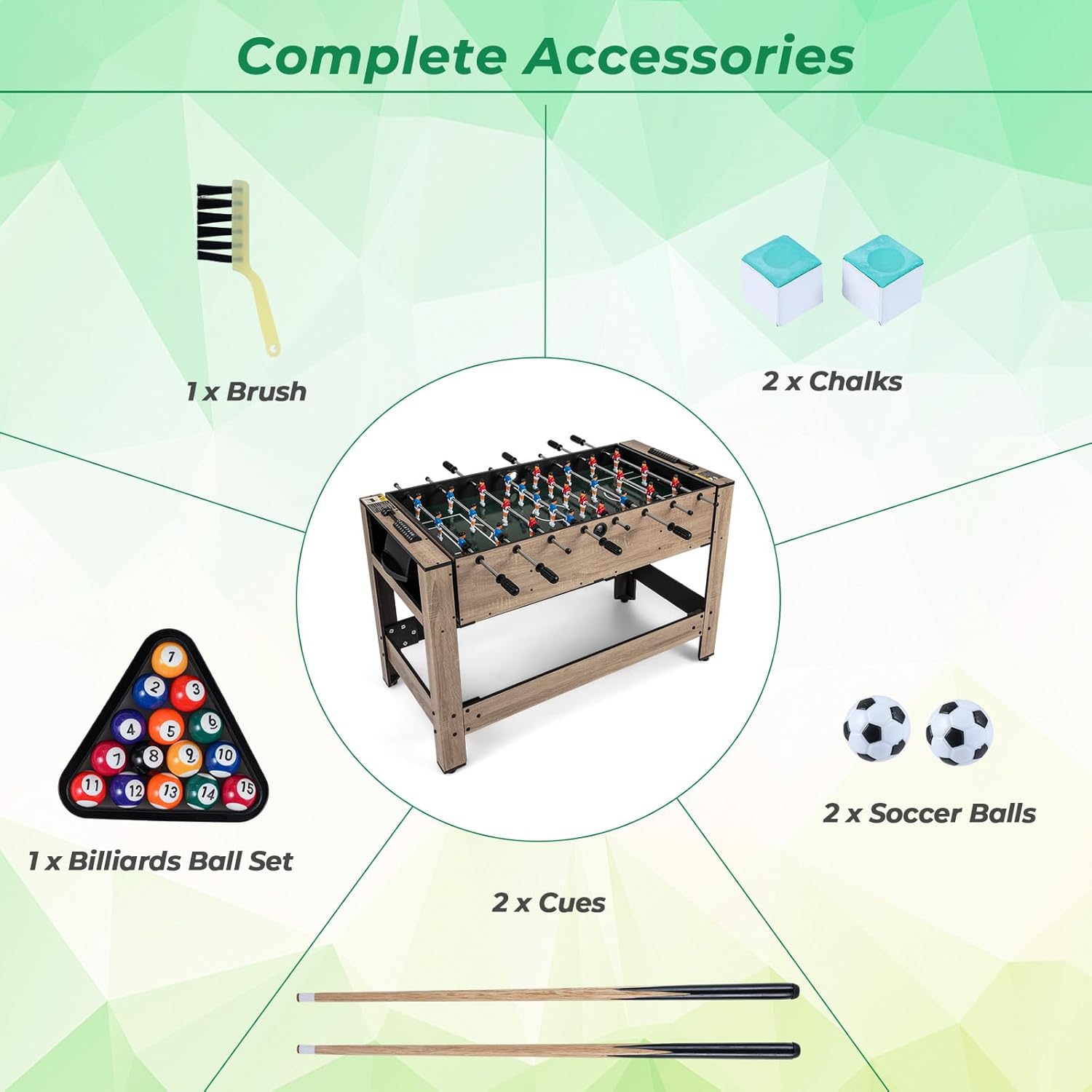 | Included Components | 1 x 2-in-1 Game Table;2 x Soccer Balls26 x Players;2 x Cues;1 x Brush;2 x Chalks;1 x Billiards Ball Set;1 x User Guide |