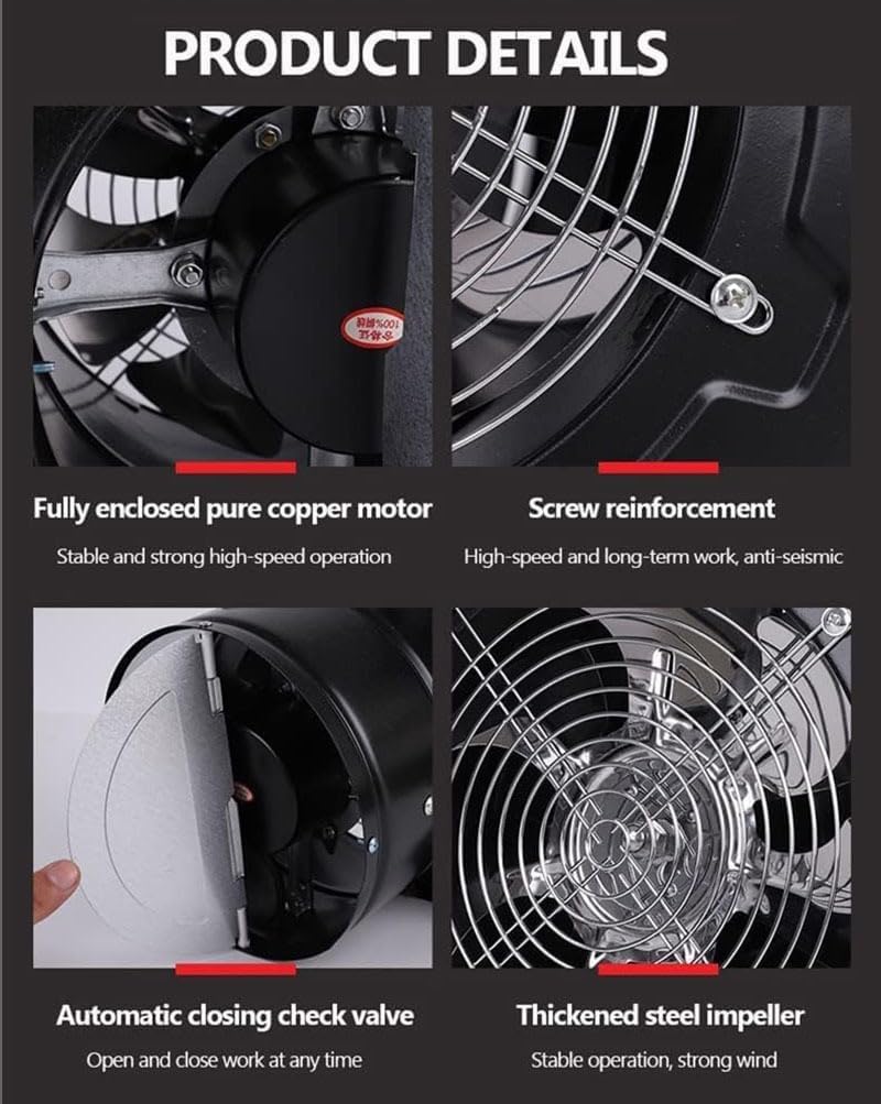 SpecificationsMaterial: Cast Iron, Steel and Iron, Aluminum AlloyProcess: PaintingMount Type: Wall Mounted or Window MountedShape: Rectangular, Round Power Source: Wired Assembly Required: NoMotor Type: Copper Wire MotorVoltage: AC 110VFrequency: 60HzPower: 80W Motor Speed: 2600r/minNumber of Fan Blades: 7Noise: About 60-70dBScrew Hole Spacing: 21cm/8.27inOutlet Diameter: 19.5cm/7.68inProduct Size: 25*25*15cm/9.84*9.84*5.91inPackage Size: 25.5*25.5*16cm/10*10*6.3inGross Weight: 2kg/4.41 lbsNet Weight: 1.9kg/4.19 lbsPackage Included1* Exhaust Fan1* English Manual