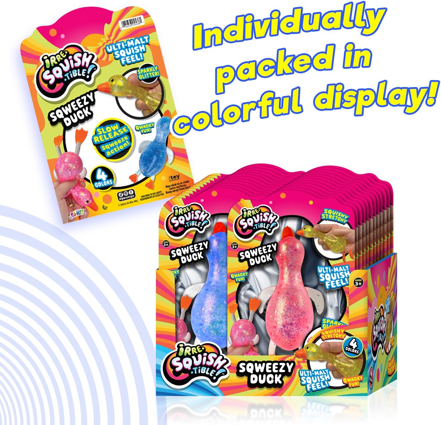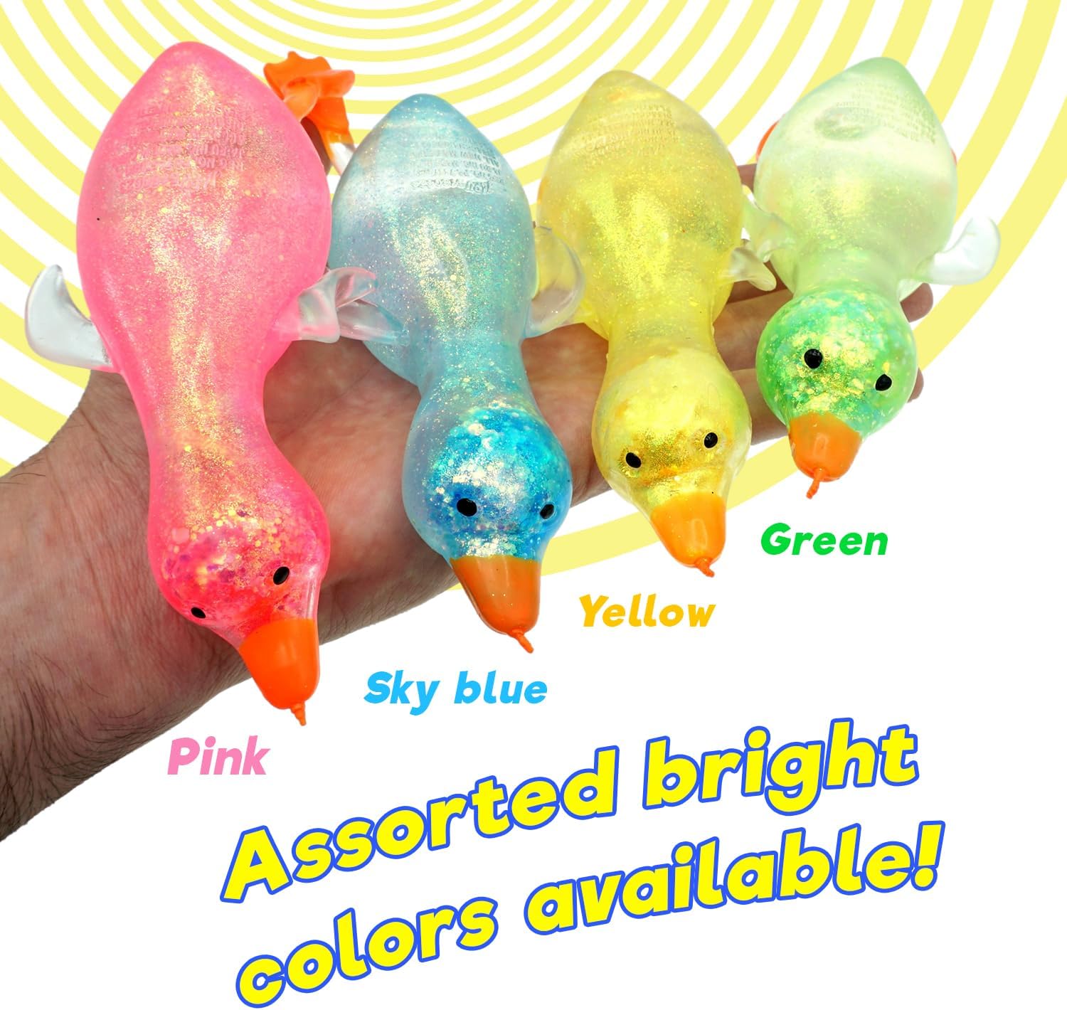 Step right into a world of squishy delight with JA-RU Squishy Glitter Ducks! These toy animal pack aren't your ordinary stress balls; they're adorable, glitter-filled companions designed to bring joy and relaxation to kids and adults alike. Crafted with care and bursting with personality, our Squishy Glitter Ducks are the ultimate fidget toy for restless hands. Squeeze, squish, and watch in amazement as the mesmerizing glitter swirls and sparkles inside their transparent rubber bodies. It's like holding a tiny galaxy of fun right in the palm of your hand! But these squishy ducks aren't just about fun and games – they're also powerful stress relievers. Feeling tense after a long day at work or school? Simply give one of these little ducks a gentle squeeze, and feel the tension melt away as you immerse yourself in the soothing sensation of squishiness. And with their compact jumbo size and lightweight design, our Squishy Glitter Ducks are perfect for on-the-go relaxation. Toss them in your bag, backpack, or purse, and take them with you wherever you roam. Whether you're stuck in traffic, waiting in line, or just need a moment of calm in the midst of a hectic day, these ducks have got you covered. Our Squishy Glitter Ducks aren't just for stress relief – they're also fantastic party favors and Easter basket stuffers. Imagine the delight on your guests' faces as they discover these cute and squishy companions nestled among their treats. It's a surefire way to add an extra dose of fun to any celebration!