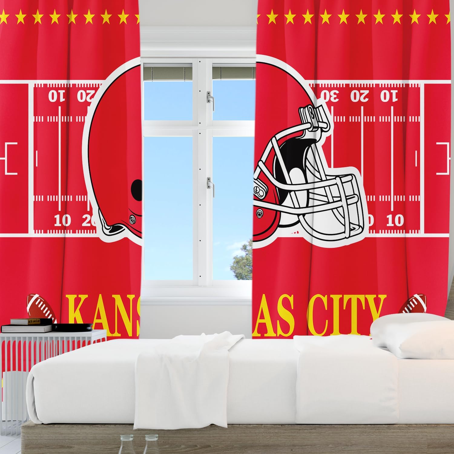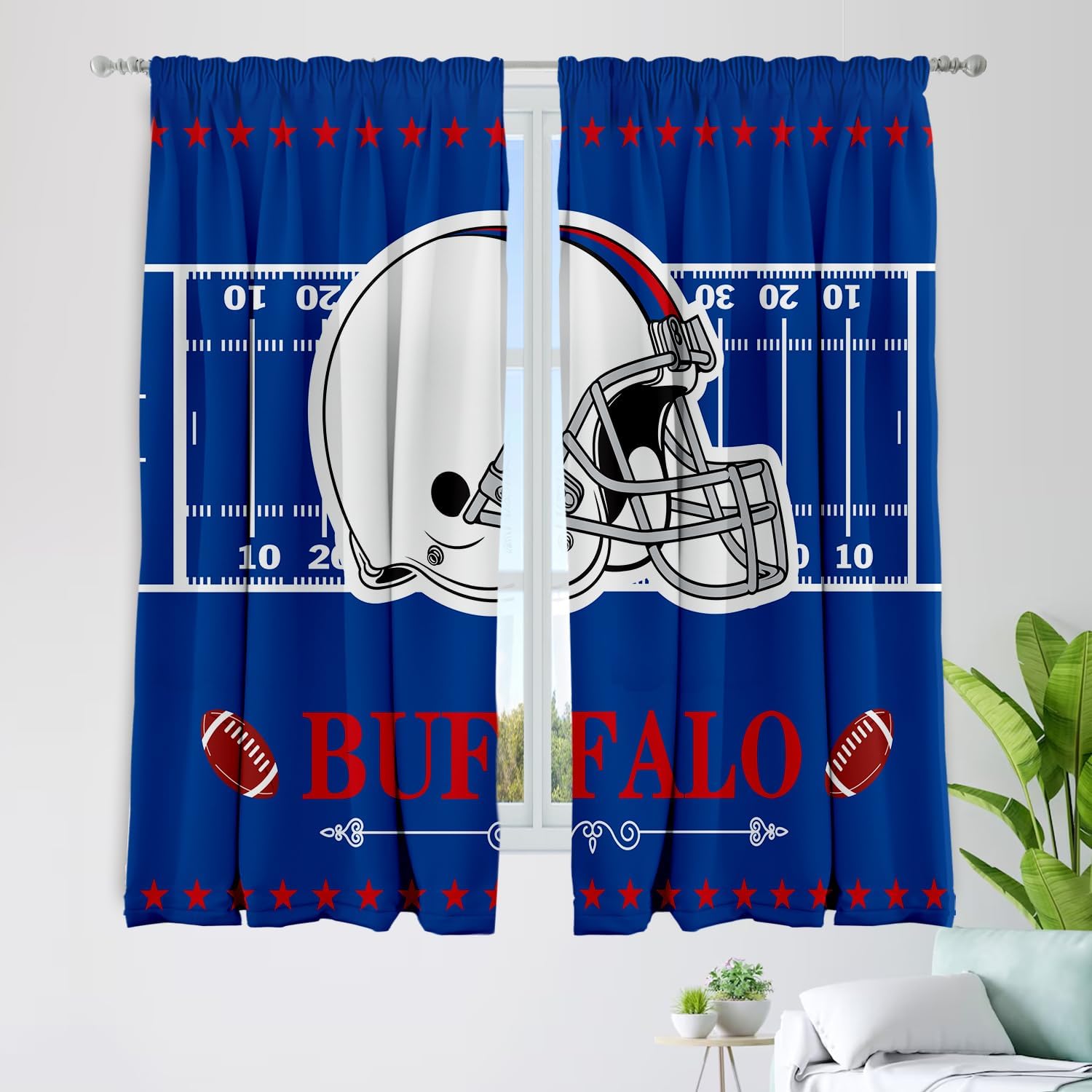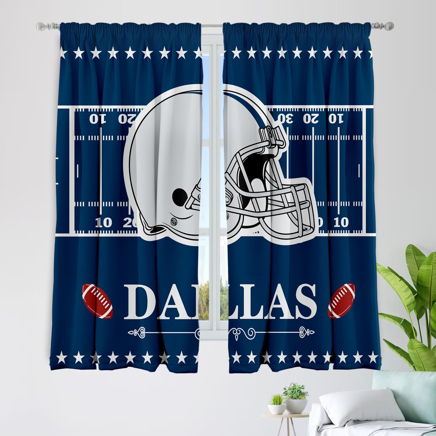 Transform your space into the ultimate fan zone with these football-themed blackout curtains, perfect for bedrooms and man caves. These 72-inch wide by 63-inch long panels combine style and functionality, creating an atmosphere that any sports enthusiast would appreciate. The blackout feature helps control light and temperature, making game day viewing more enjoyable. These curtains add a bold statement to your Dallas-themed room decor while providing the privacy you need. The panels are designed for easy installation and maintenance, helping you create that perfect sports sanctuary. Whether you're watching the big game or just want to showcase your team spirit, these curtains serve as both a practical window treatment and a standout decorative element. The generous dimensions ensure proper coverage while the quality construction maintains its appearance through regular use.