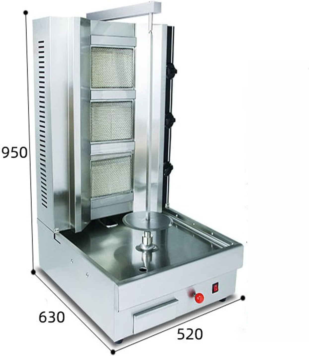 Machine parameters Electric model: Machine voltage: 220/50Hz Machine size: 520*630*1 150mm Machine power: 10. 3KW Food support: total length 820mm Temperature range: 50-300C Control switch: 4 independent temperature control switches Gas model: Working pressure: 2800P Machine size: 520*630* 1050mm Thermal efficiency: 10.4Kw Food support: total length 820mm Energy use: liquefied petroleum gas/natural gas Valve used: low pressure regulating valve