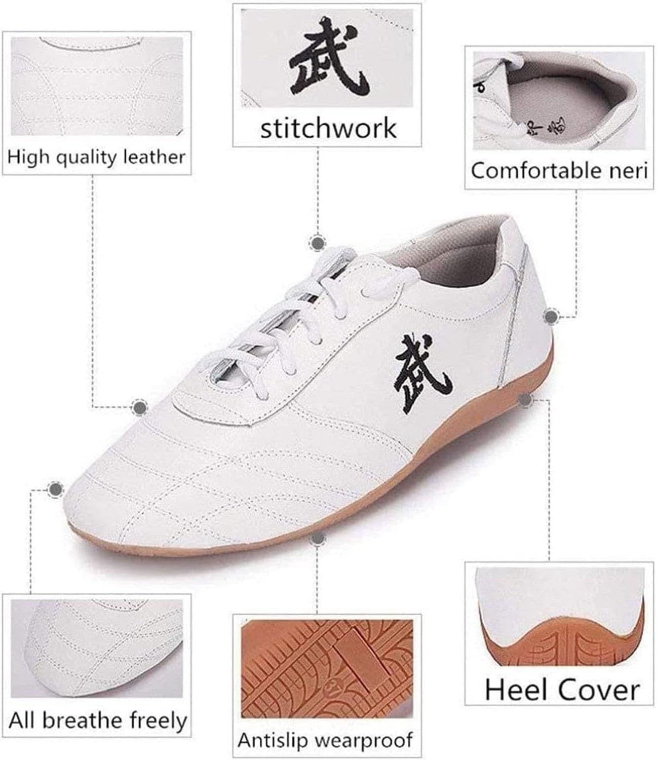 STORYTai Chi (also called Taiji) is an ancient Chinese exercise form that was originally created as a martial art. It can look back on a long history of over 700 years, according to other origins even up to 1500 years.EXCELLENT QUALITYMade of high quality cowhide leather (synthetic), the shoes are soft, comfortable and easy to care for. They are pressure-resistant and are excellent at reducing vibrations. Your feet are effectively protected.COMFORTABLEWith soft and non-slip TPR soles (imitation of ox tendon soles), the shoes make users feel comfortable and at ease, which meets the requirements of martial arts practice.CONVENIENT TO CARRYThe shoes are fashionable, easy to wear. They can be worn at home or outside for outdoor activities. The Chinese style design with embroidered characters for “Wushu” matches both casual and fashion clothes.About the size:EU 34 Length: 22 cmEU 35 Length: 22.5 cmEU 36 Length: 23 cmEU 37 Length: 23.5 cmEU 38 Length: 24 cmEU 39 Length: 24.5 cmEU 40 Length: 25 cmEU 41 Length: 25.5 cmEU 42 Length: 26 cmEU 43 length: 26.5 cmEU 44 Length: 27 cmEU 45 Length: 27.5 cmEU 46 Length: 28 cm