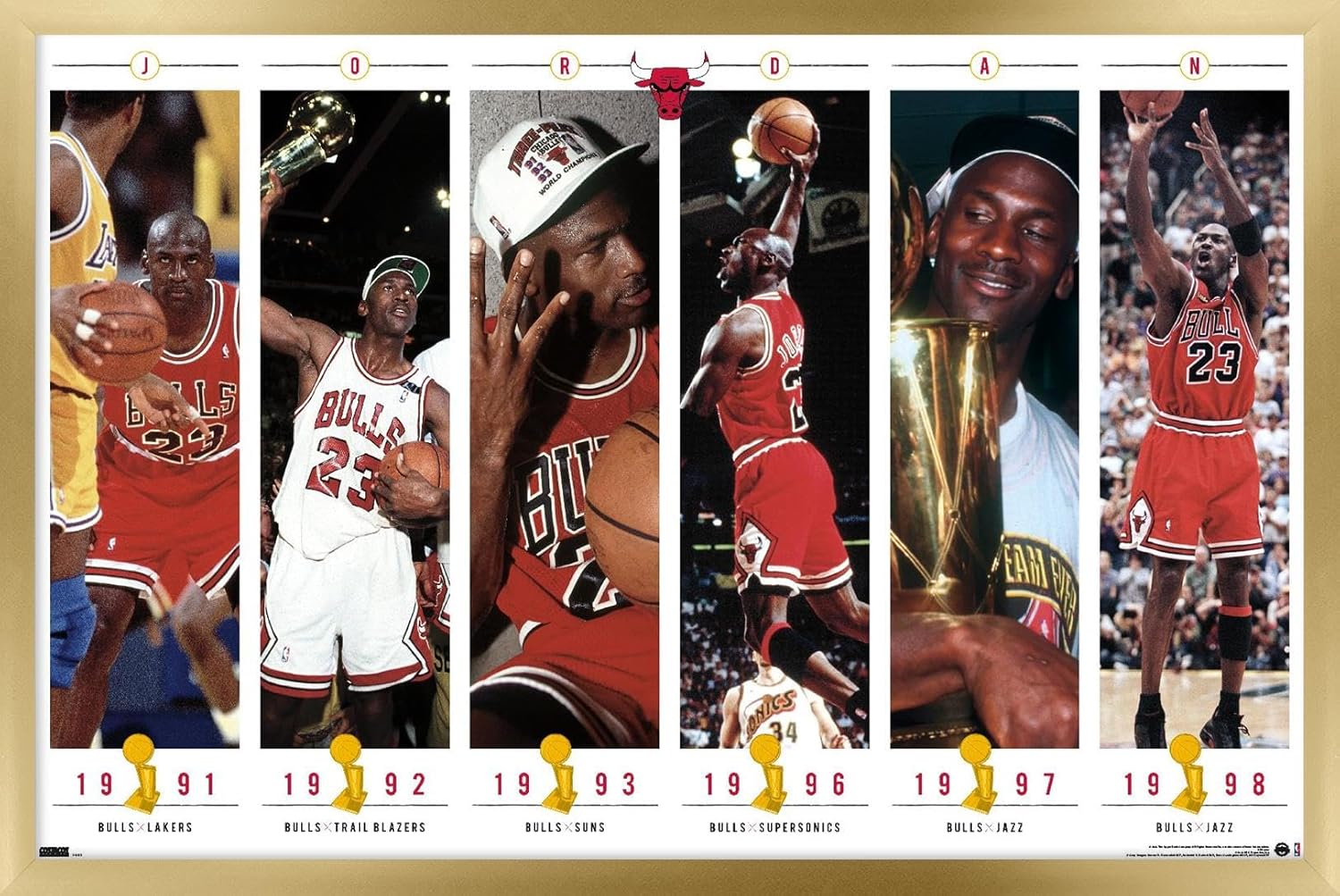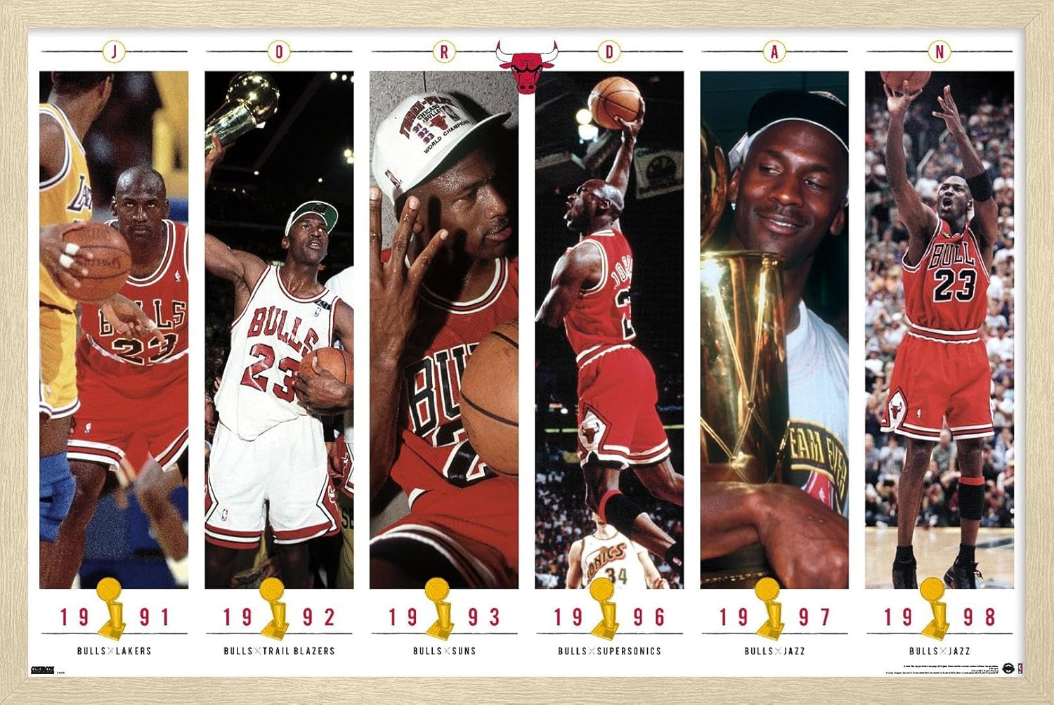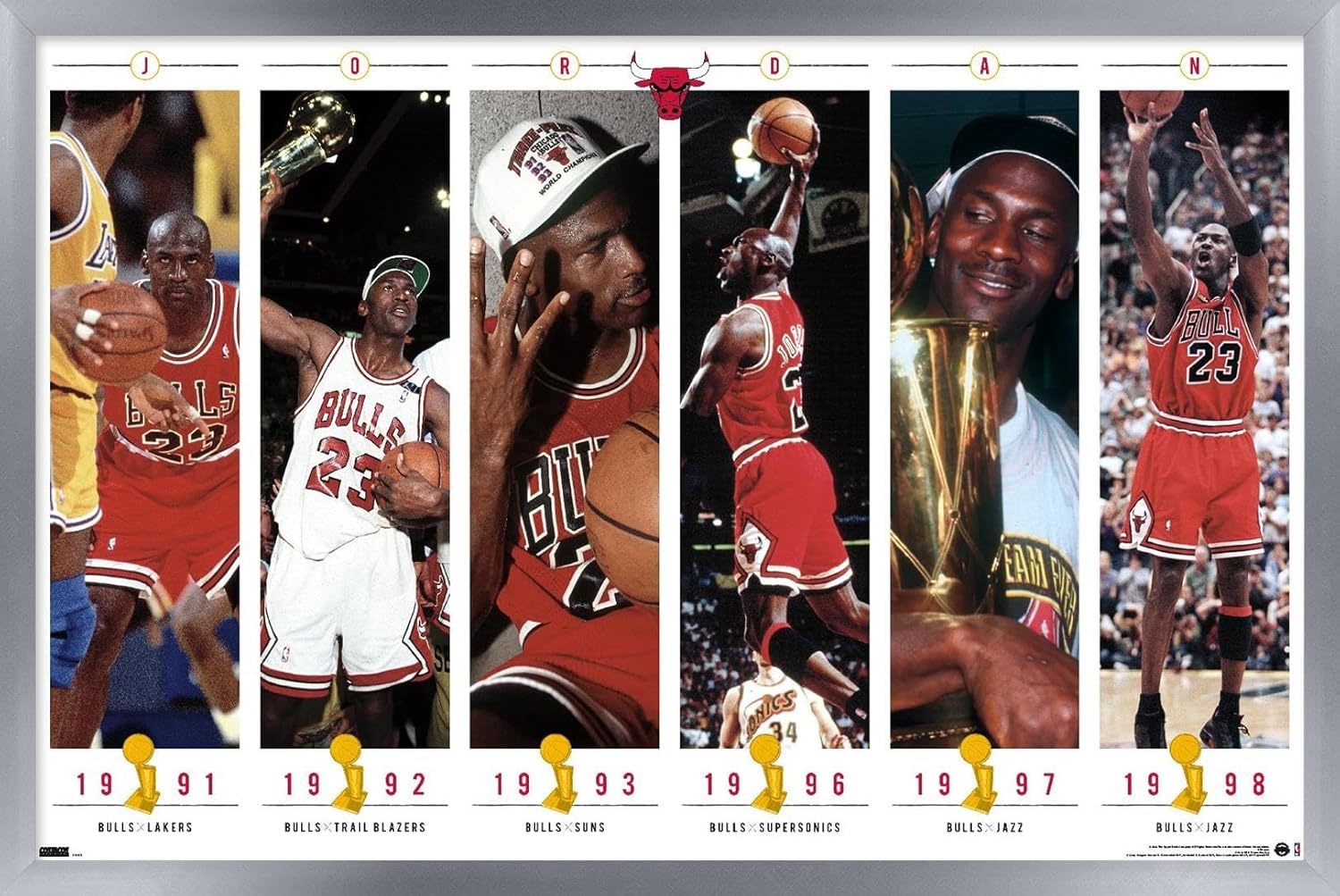 Trends International framed posters are everyone's favorite room decor! The clean, modern design and premium satin finish of this Michael Jordan - Championships Wall Poster will make a bold wall decor statement in any room. Decorate the bedroom, bathroom, kid's room, living room, office, dorm, and more! Our framed posters are lightweight and easy to hang using the sawtooth hanger so you'll be able to enjoy it in no time. Every one of our framed posters are proudly Made in the USA. Add these decorations alongside the other accessories on your party supplies list too! Trends International's wall posters are the perfect way to dress up your parties. A framed poster makes a great gift as well! Whether it's for a birthday, Christmas, house warming or for your best friend, they'll love receiving a framed poster to show off their style.