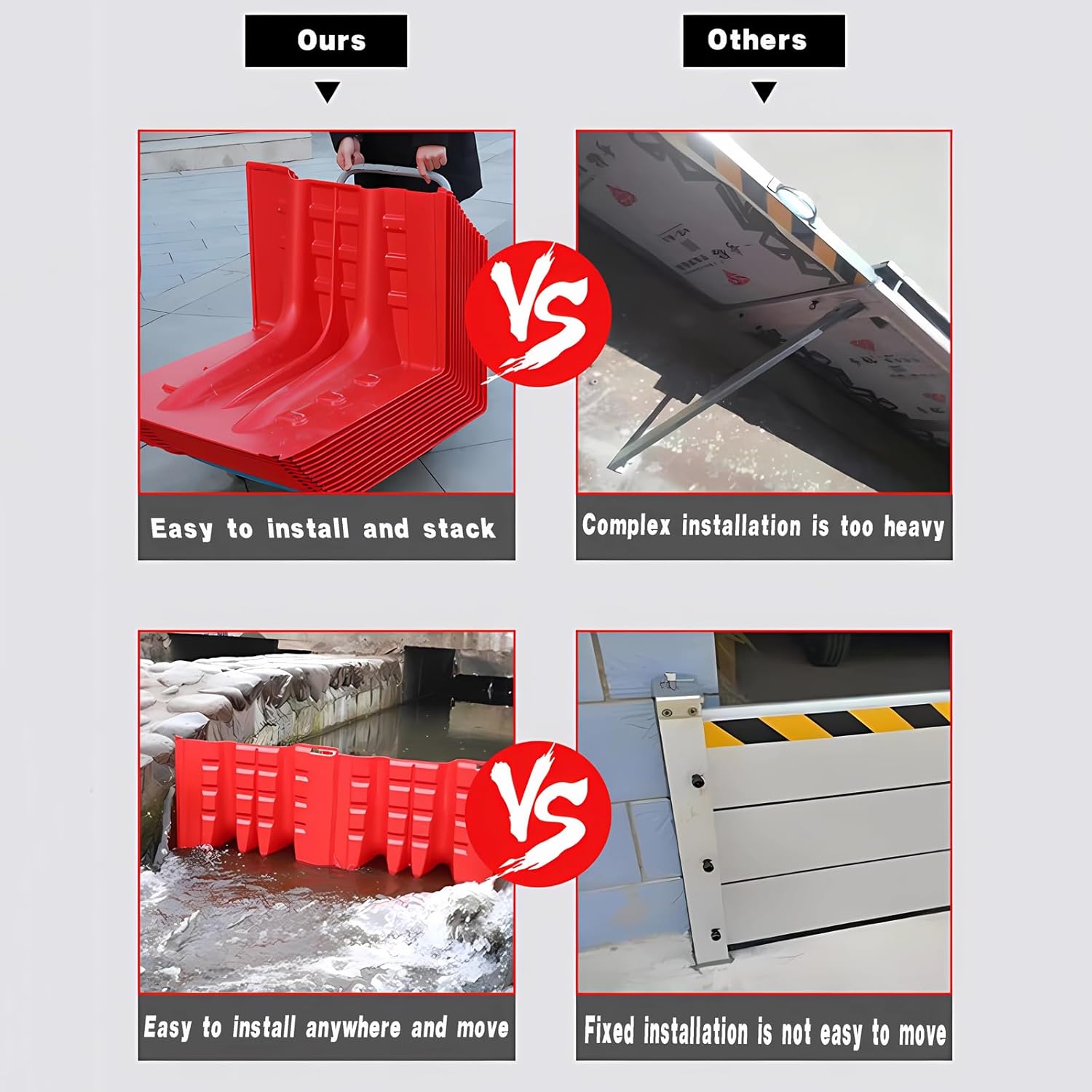 【Product Description】When flooding threatens, every minute counts. This L-shaped modular flood barrier kit gives you the edge, letting you build a solid water barrier at your doorstep in just minutes. Each panel is crafted from strong ABS plastic that clicks securely into place—no tools, no drilling, no delays.It’s designed for real-world use: fast to set up, easy to adjust, and tough enough to help keep your entryways dry during storms or drainage overflows. Whether you're protecting a garage, a basement entrance, or a warehouse threshold, this kit has you covered—and when the skies clear, it stores away neatly, ready for next time.【Specifications】Weight per panel: Approx. 3.3kgPanel lengths: 20.8" / 53cm, 26.7" / 68cm, 27.5" / 70cmMaterial: ABS plasticAssembly: No tools required – snap-fit modular systemInstallation area: Entryways, driveways, basement doors, garage thresholds