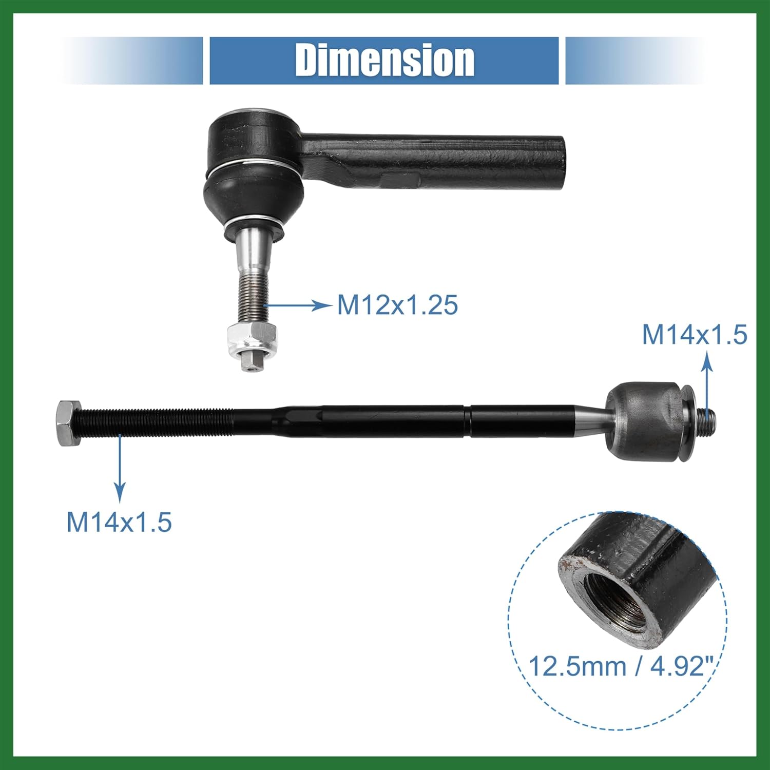 Features:Front inner and outer tie rod ends are made of good material for long-lasting dependability and durability under bad conditions. This resisted abrasion and environmental corrosion.Restores like new steering and handling.Durable surface treatment for anti-rust.This is a non-OEM product, accessory only!Specifications:Material: MetalColor: Black, Titanium ToneFront Inner Tie Rod OE Number: EV80645Front Outer Tie Rod OE Number: ES800408Other Part Number: 52050446AC, 68019642AA, 68019642AB, 68019643AA, 68019643AB, 68040224AA, 68040224AB, 5183761AA, 5183761AB, 5183761AC, 5183761ADPlacement On Vehicle: Front, Left, RightInner Tie Rod Length: 31.5cm / 12.40"(L)Inner Tie Rod Thread Size: M14x1.5Outer Tie Rod Size: 14.5x10.5x3.8cm / 5.71"x4.13"x1.50"(L*W*H)Outer Tie Rod Thread Size: M12x1.25Outer Tie Rod Hole Diameter: 12.5mm / 4.92"Fitment: for Dodge Caliber 2007-2012for Jeep Patriot 2007-2017for Jeep Compass 2007-2010for Jeep Compass 2012-2016Installation Steps: Loosen the pinch nut and remove the cotter pin.Remove the castle nut and the outer tie rod end.Remove the boot and the inner tie rod end.Replacing a new tie rod and installing it back according to the method of disassembly.Package Includes:2 x Inner Tie Rod Ends Links2 x Outer Tie Rod Ends Links2 x Tie Rod Boots2 x Accessory
