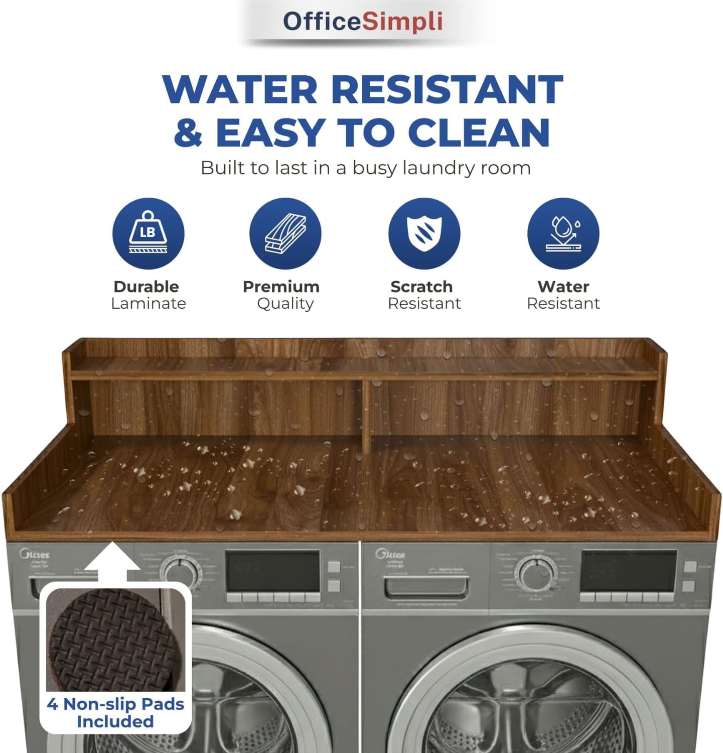 Transform your laundry routine with the 2-tier large washer and dryer countertop, thoughtfully designed to bring functionality, safety, and modern style into your space. This versatile laundry topper stackable washer and dryer is perfect for maximizing your area, whether you're outfitting a compact apartment or a full-sized laundry room. The main surface offers a spacious 58" x 30" area—ideal for folding clothes, organizing baskets, or setting up over washer and dryer shelves. This layout is great for keeping everything you need within arm’s reach while optimizing limited room. Safety and usability go hand-in-hand with this countertop. The 2.75" high railings on three sides prevent items like socks or detergent bottles from slipping through gaps. The curved guardrail design adds a smooth, safe finish that reduces injury risk and adds a modern touch to your laundry setup. Built with a 0.75-inch thick, durable structure, this laundry topper for washer and dryer delivers strength and long-lasting support. The unit weighs and includes a non-slip pad to help stabilize the surface, even during wash cycles. It protects your machines while providing a dust-resistant and easy-to-clean top layer—perfect for families, rentals, or busy homes. This washer dryer counter top is simple to assemble and fits most front-loading laundry machines. Whether you need a countertop washing machine shelf, a laundry machine topper, or a compact folding table for laundry room setups, this unit combines utility and elegance in one clean solution. Check your machine’s measurements to ensure a perfect fit and elevate your laundry experience today.