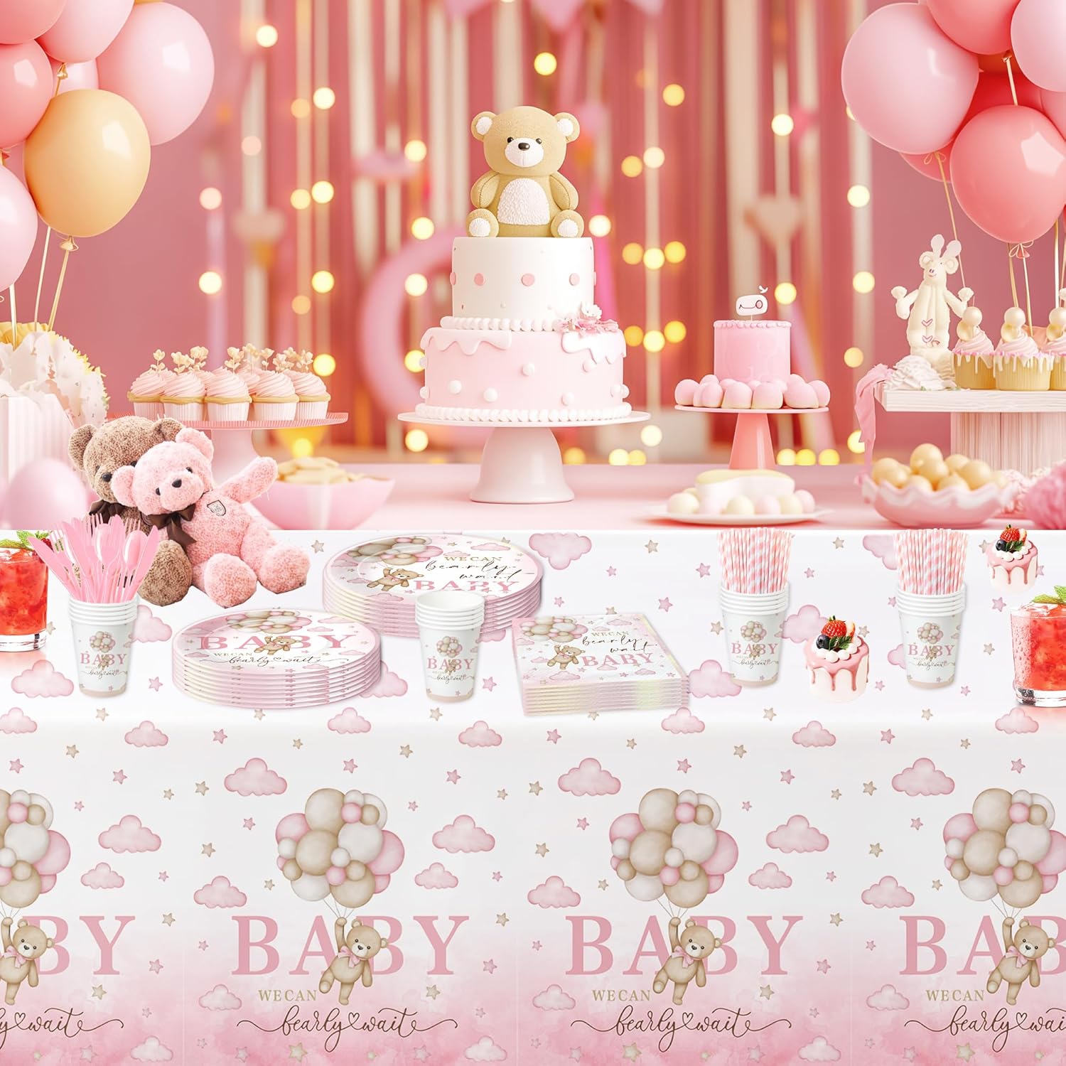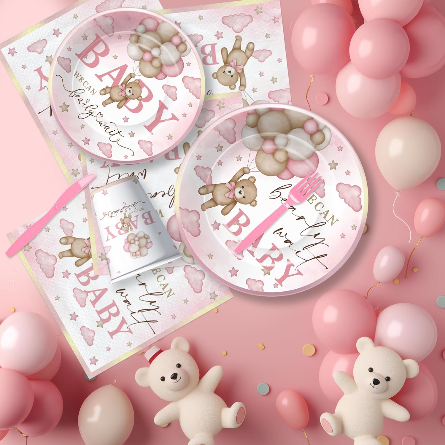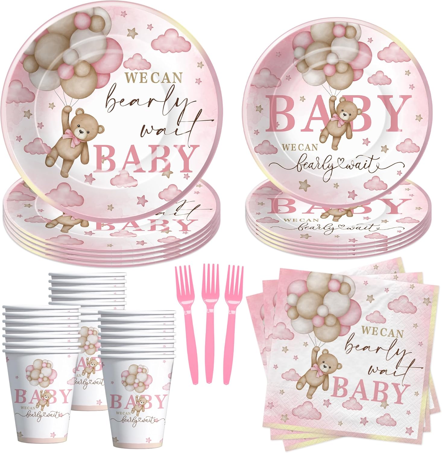Pink Bear Baby Shower Party Plates and Napkins Party Supplies And Decorations Tableware For Girls Includes: 24 Set x Disposable Cutlery Set 24 Pcs x 9'' Bear Party Plates 24 Pcs x 7'' Bear Paper Plates 24 Pcs x Party Napkins 24 Pcs x 9oz Cups Make your celebration unforgettable with our bear baby girl party decorations tableware set. The charming and playful design will surely bring your guests joy and make your party memorable