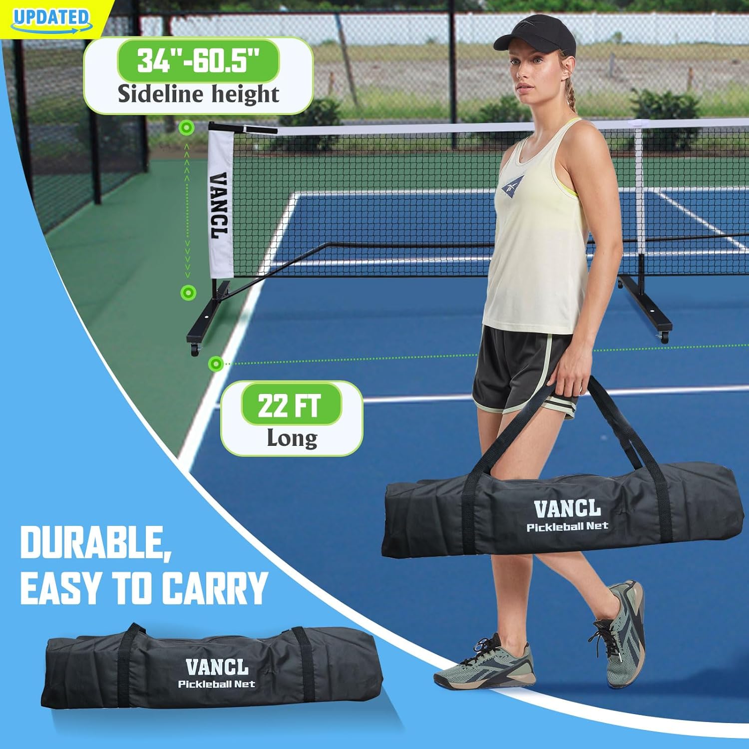 VANCL Badminton Pickleball Net with Wheels Movable, 22 Feet Deluxe Pickleball Net System, Adjustable Strong Nylon Pickleball Net Portable Outdoor with Carrying Bag Metal Frame for Various Games