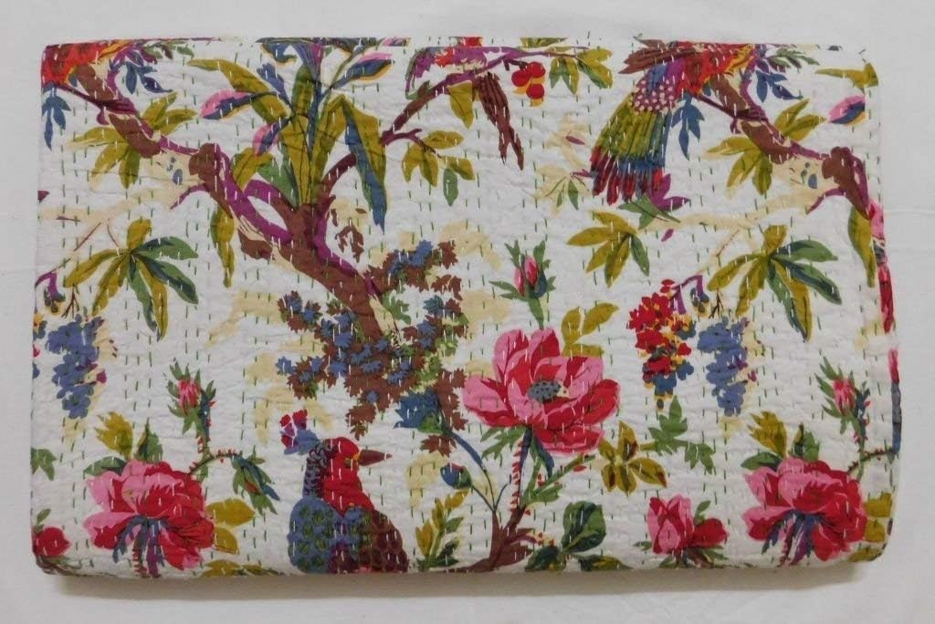 Made with 100% cotton and natural vegetable colors. This piece of art is completely hand stitched by Women artisan in Rajasthan, India. It can make any room alive with its vivid colors, stunning print,made using traditional and famous kantha hand method. Made from two thin layer of cotton fabric make this piece of art irresistible and also very comfortable. Adding to its style, this kantha quilt is reversible and both sides can be used. Kantha is still the most popular form of embroidery practiced by rural women. Typically use old saris and cloth and layer them with kantha stitch to make a light blanket, throw or bedspread. This cotton lightweight "Quilts" with a beautiful and colorful Bird design can be used as: 1. Bedspread, Bedding Throw, Blanket or Quilt 2. A Summer Bed Cover. 3. A Fabulous Picnic Rug 4. Nice Bedroom Quilt. Size Twin (60X90), Queen Size (90X108 inch), King Size (108X108) inch