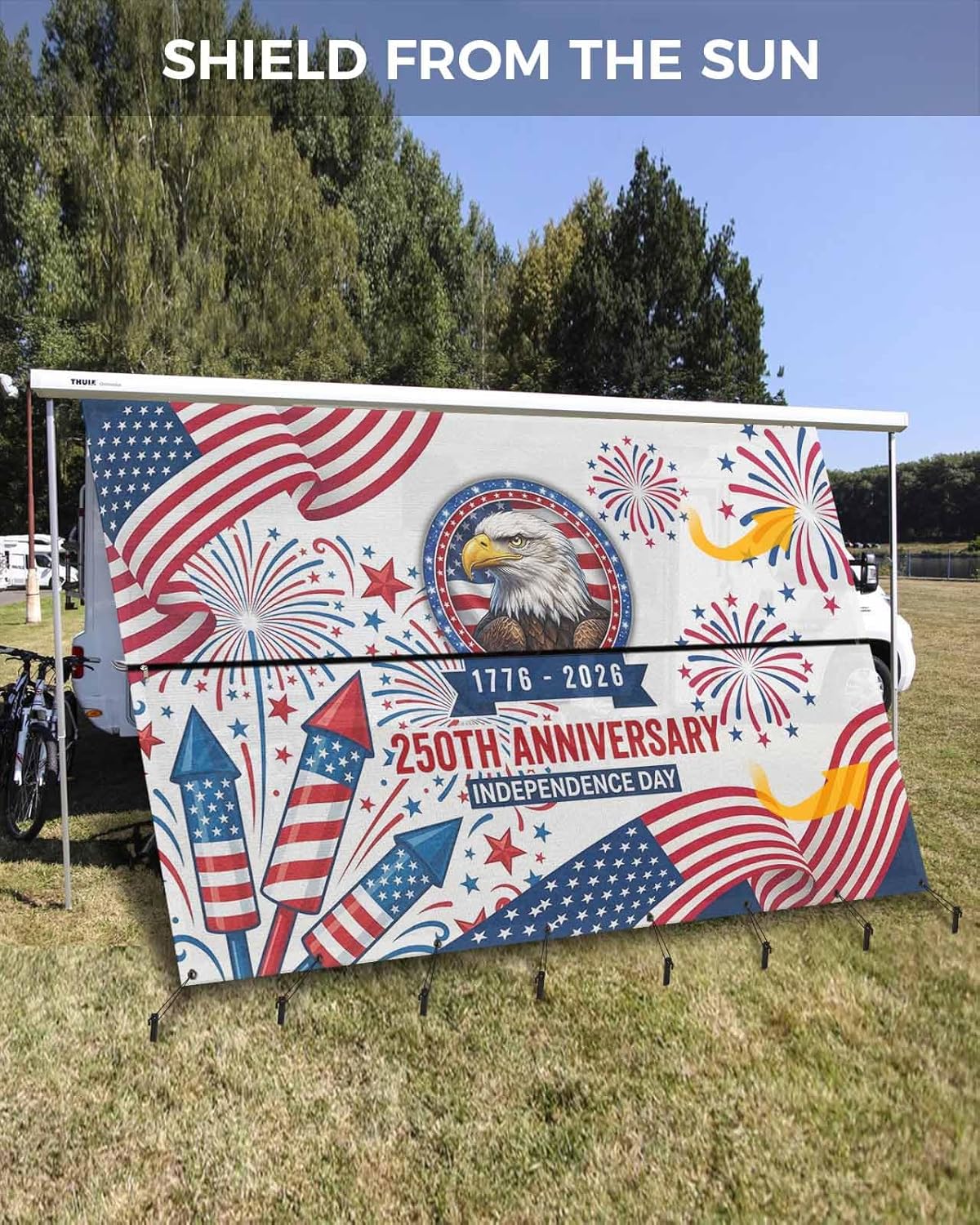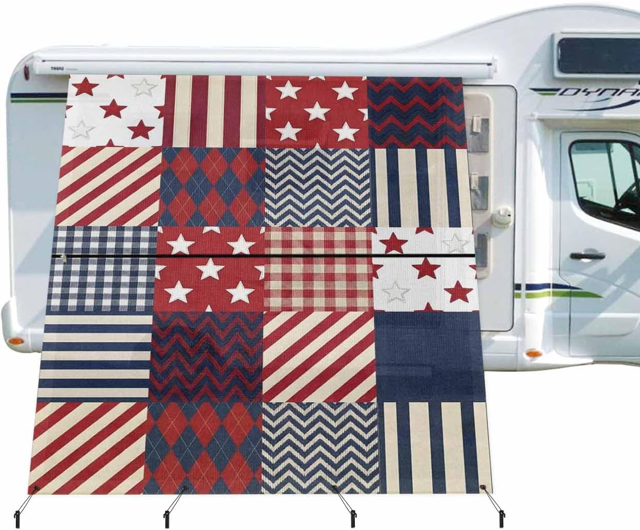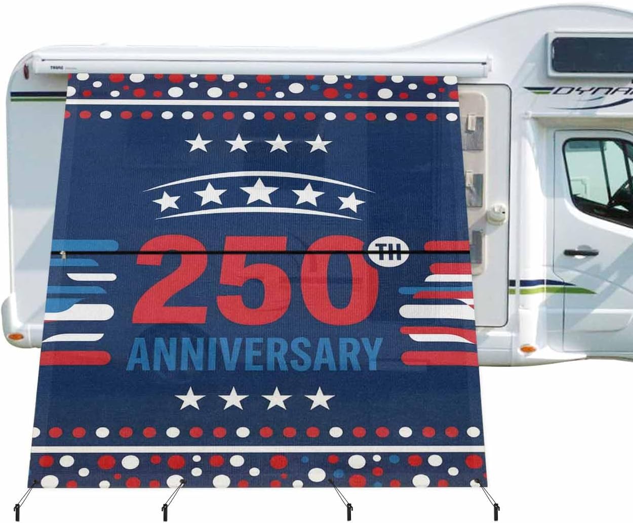 Premium High-Density Polyester Mesh Privacy Motorhome Awning Sun Shade Screen, An Essential Addition for Camping Trips.How to Choose Your Perfect Fitted SizeMethod A: Please measure your existing awning from center of arm to center of arm. This 9'x13'3" shade has a finished fabric measurement of 9' drop by 13'3" length and fit for 14' motorhome awning.Method B: Measure your awning fabric length and choose same length of our motorhome shade. For example you measure your awning fabric as 14', please simply choose this 9'x13'3" shade.Why Choose Our Motorhome Awning Side Shade1. These motorhome sun shade screen help block out those crazy sun rays that try to beat you down while camping and also give you privacy when camping right next to others.2. Motorhome awning sun shade side screen can be easily fixed by sliding into the motorhome awning rail with coming poly-cord. You just leave the upper section on to roll in and out with the patio awning and zip on the lower section when needed.3. Bungees fastest fix compared to normal rope tie down. When the winds whip up and storms come in, you just unzip it and roll in the awning and stow the bottom section with the bungees, it's that easy.4. High-density material mesh has better durability and will retain its color after long-term use.The bottom of the motorhome awning screen is equipped with 8 thick grommets that no crack by strong pulling and do no rust in extreme weather.5. The motorhome awning side shade screen helps avoid your motorhome awning from being blown down and damaged by the wind.6. This outdoor awning sunshade screen is designed to fit a wide range of popular awning systems, ensuring versatility and ease of use.Package Include8 x Plastic Stakes8 x Bungee Cords1 x Awning Shade Screen 9' x 13'3" (9 Feet Drop, 13.3 Feet Length)
