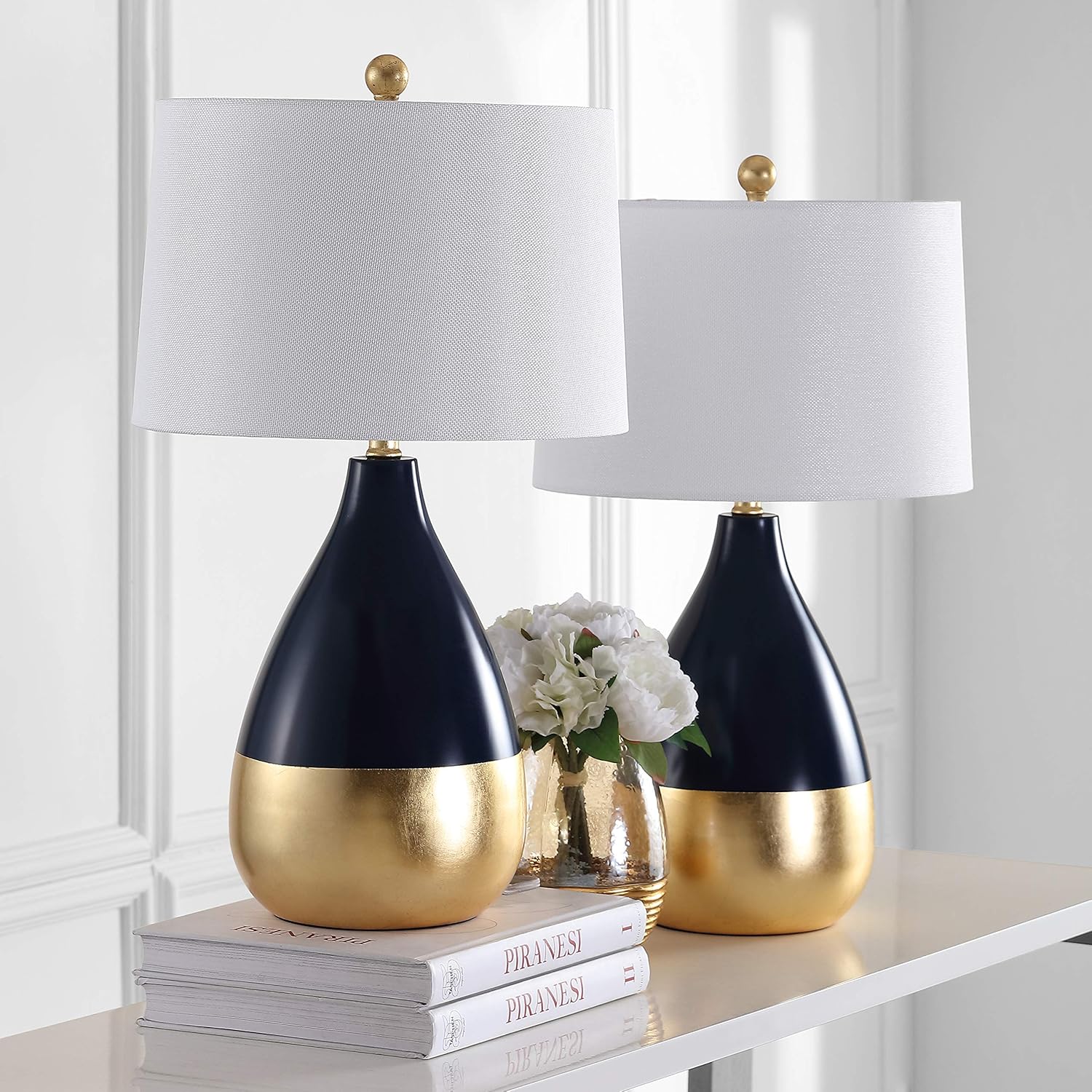 The decadent decor of a London's designer's lush home inspired this set of 24-Inch Navy and gold table lamps. Place on either side of a living room armoire for a radiant focal point that speaks to the educated eye, or in the boudoir for an opulent touch.