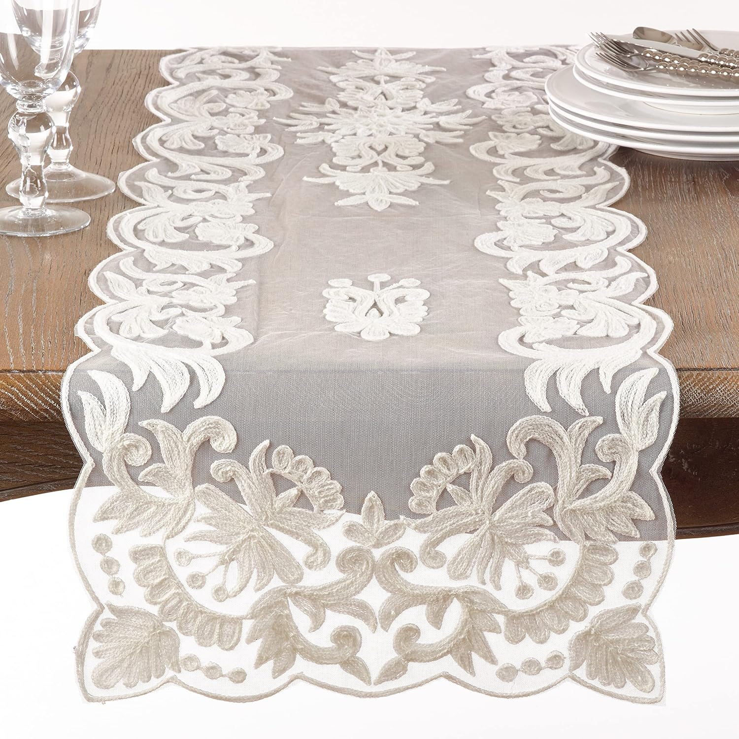 Boasting delicate, intricate flourishes, this table runner adds elaborate decorative flair to your table. With an airy design, the table runner layers beautifully over other linens and creates a lovely entertaining space for meals with loved ones.