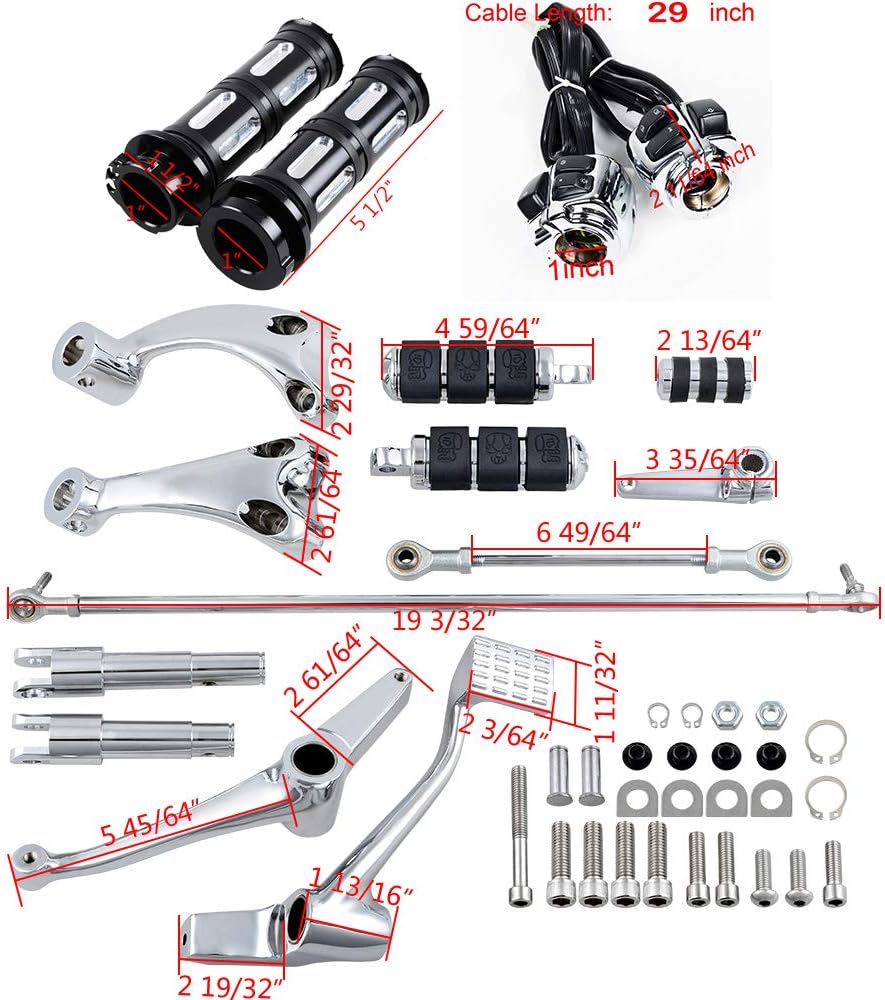 Packet Condition: Brand New 100% Packet contains: - Completed Set Forward Control Peg Levers Linkage, Mouting Accessories - 1 Pair Motorcycle Handlebar Headlight Horn Turn Signal Light Switch with Harness + Left Right of Motorcycle Hand Grips * Item weight: 4470g (9.85lbs) Compatible with 2004-2012 Harley Sportster XL 883 1200 with 1'' Handlebar 1" Bar Side and 1" Throttle Side Description Forward Control: * Dimension (Picture indicates whole set) - Color: Chrome and Black - Made of high quality Billet CNC Aluminum and rubber Handlebar Headlight Horn Turn Signal Light Switch with Harness: * Dimension: Diameter Of Hole: 1'' (25mm) -- Cable Length: 29'' (73cm) * Color: Chrome Housing, Black Button - Voltage: DC 12V - Made of Aluminum Housing and Plastic Button Motorcycle Hand Grips: * Dimension: Left (Bar Side) Hole: 1" (25mm) - Right (Throttle Side) Hole: 1" (25mm) * Outer Diameter: 1 1/2" (3.8cm) -- Overall Length: Left (Bar Side): 5" (12.7cm) - Right (Throttle Side): 5 1/2" (14cm) * Color: Chrome and Black - Made of Billet CNC Aluminum and Rubber Attributes Forward Control: * The complete assembly used for brake and shifter sides * Made of Billet CNC Aluminum and rubber for anti slip and strong move * Mounting easily with necessary accessories included Handlebar Headlight Horn Turn Signal Light Switch with Harness: * Not Interfere With Clutch. All-In-1 Design. Built In Switch Control. Compact Size * Left Side: Switch For Horn, High/Low Beam Headlight and Left Turn Signal * Right Side: Switch For Kill, Ignition Start and Right Turn Signal * Install Easily. Easy Access and Comfortable Control. Motorcycle Hand Grips: * Rubber Band Helps Reduce Discomfort And Strain On The Hands * Offering The Rider A Very Comfortable Feel As Well As Better Control
