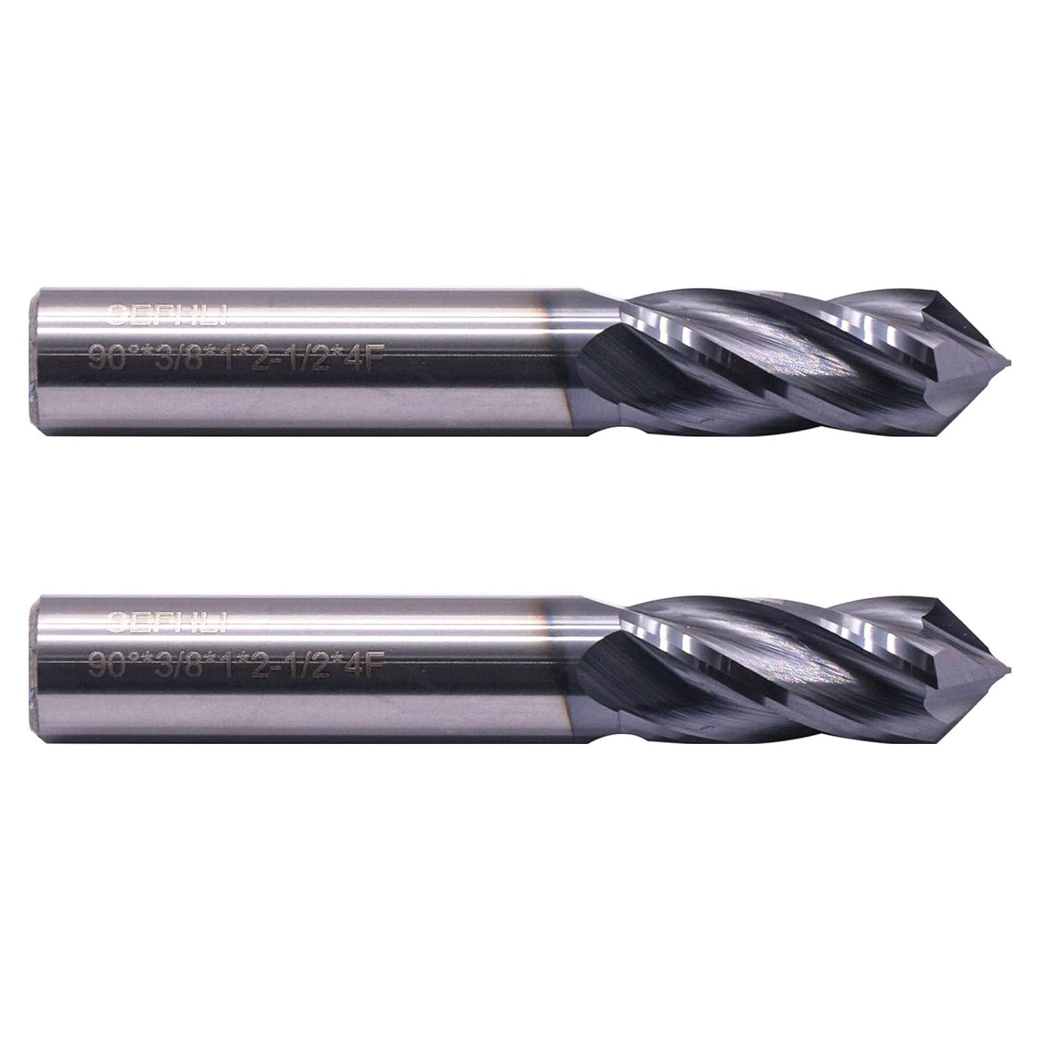 Specifications:3/8" cutting diameter x 3/8" shank diameter x 1" length of cut x 2-1/2" overall length4 Flute, 90ยฐ Included Angle, Solid Carbide Drill Mill, AlTiN CoatedPackage Included:2pcs 3/8" 4 Flute 90 Degree Solid Carbide Drill MillsFeatures:AlTiN Coating: Titanium aluminum nitride (AlTiN) coating lubricates the end mill for stability at high temperature and superior wear resistance at high cutting speeds for improved tool life and increased production output, offering better heat resistance than TiAlN, TiN or TiCN coatings.SEFHLI end mill is made from solid carbide, which gives it exceptional toughness, durability, and machinability and offer long tool life and faster cutting speeds than other substrates, Carbide can run at higher speeds than high-speed or cobalt steel, resisting wear and high cutting temperatures.Precision ground using the highest quality grinding wheels. High strength and hardness, abrasion resistant, practical, easy to use and durable in use.Application:Used for general purpose milling in most materials of medium hardness such as wood, steel, Common Steel, stainless steel, alloy steel, carbon steel, cast iron, Copper Alloy and nonferrous materials.