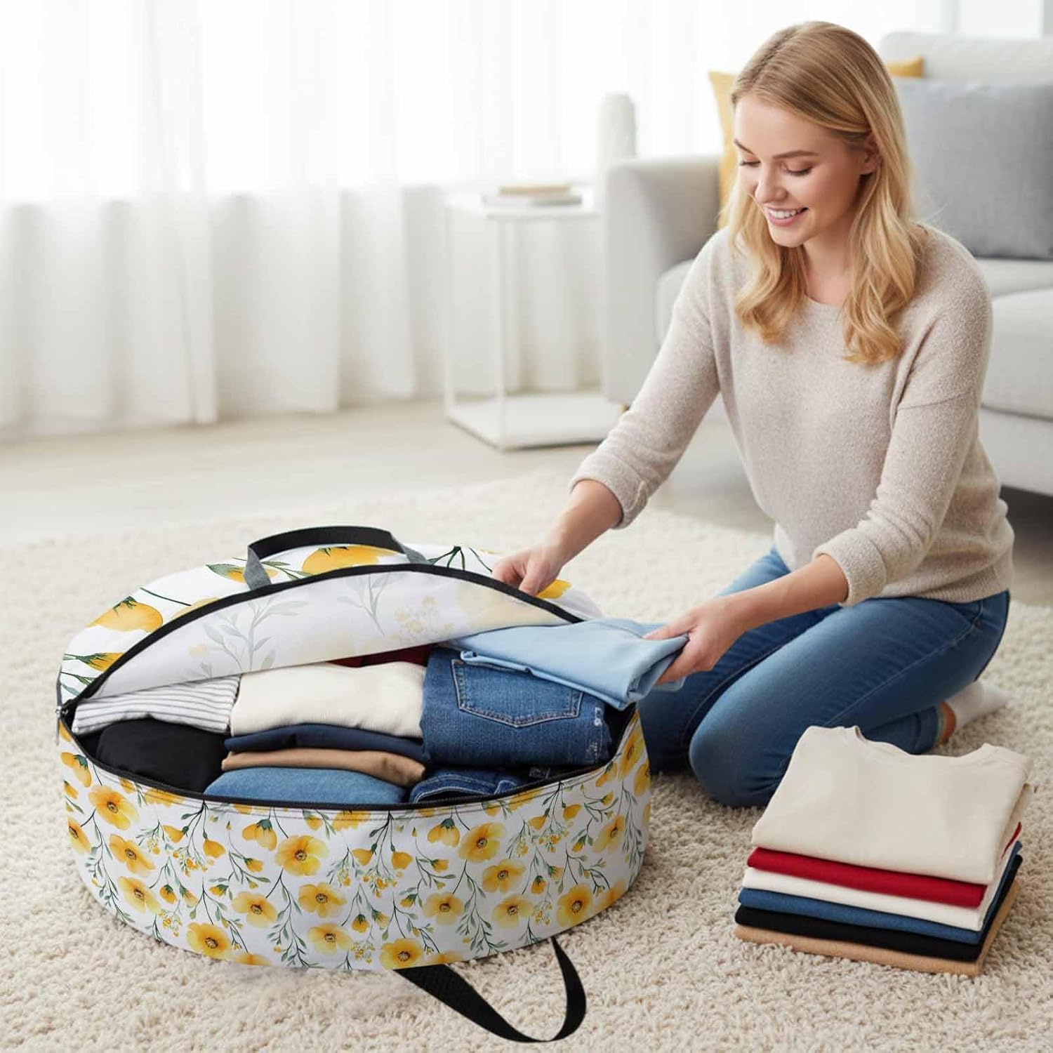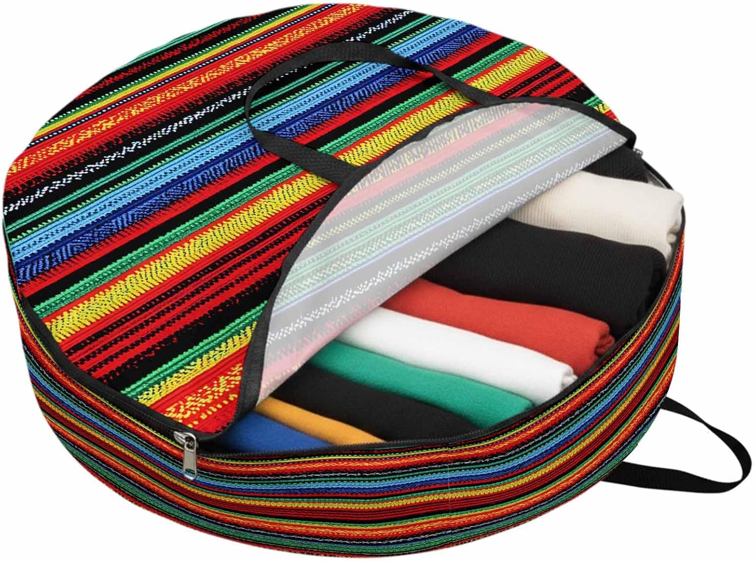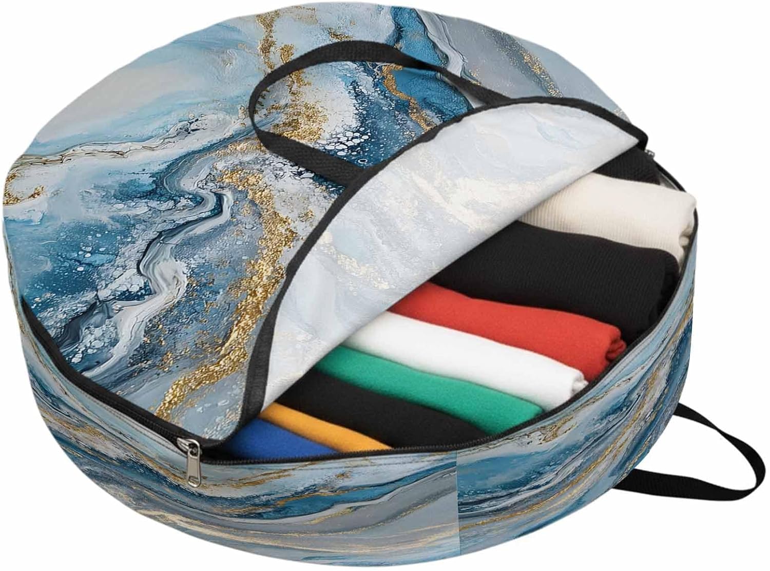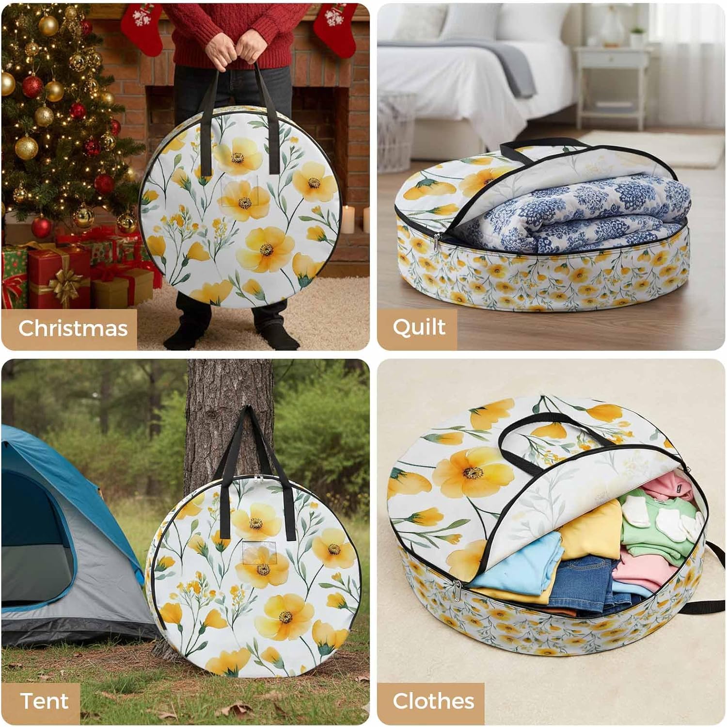 Reclaim Your Closet Space with the Round Storage Solution! Material: polyester Diameters: 24 inch, 30 inch, 36 inch Depth: 7 inches Package Includes: Round Storage Bag One Bag, Endless Possibilities: Whether you are swapping out your summer wardrobe, moving into a new dorm, or packing away holiday decorations, this bag has you covered. The circular design is uniquely suited for: Bedding: Comforters, quilts, sheet sets, and oversized pillows. Clothing: Winter coats, sweaters, and bulky ski gear. Home Decor: Holiday wreaths, garlands, and floral arrangements. Outdoor Gear: Camping blankets, sleeping bags, and beach towels. Dual Zippers: The high quality double zipper design allows the closet organizer to open wide from both sides, making it effortless to load and unload even the bulkiest comforters or wreaths. Reinforced Handles: Sturdy, reinforced handles are securely stitched to provide extra strength and a comfortable grip when carrying heavy loads or pulling the bag from under a bed. Clear Label Pocket: A transparent built-in label holder allows you to quickly identify the contents of each bag without ever having to unzip it, keeping your storage perfectly organized.