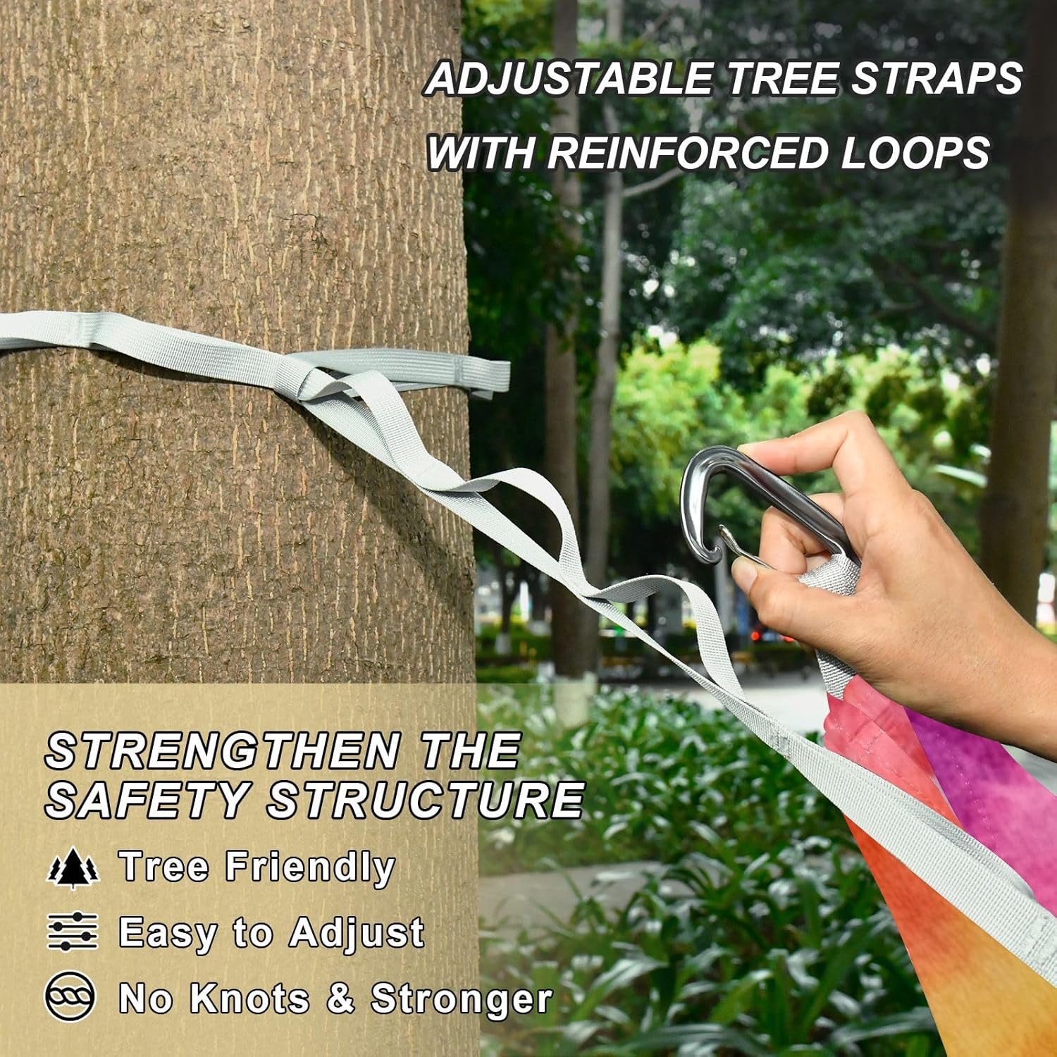 Large Size Width: 114in/290cm ×54.33in/138cm. Although Swing Hammock is used as a hammock, the space is large enough to accommodate two people to rest together. It can bear a load of 330LB/150KG.Wear-resistant Materials: High-strength and breathable 210T polyester hammock fabric, aluminum alloy climbing buckles, high-density 600D imitation nylon webinar. Portable Hammock has good wear resistance and load-bearing performance.Design: This hammock's webbing is equipped with multiple adjustable rings, making it convenient for users to adjust the height and position of the Fabric Hammock according to the actual situation. There are also hanging pockets along the edge of the hammock, which can be used to store personal items.Multi-scenario Applications: Seaside, Safari, back garden, indoor and outdoor, hiking or camping, etc. Swing Hammock can be given as a present to friends and relatives who love outdoor sports.Warm Reminder: When cleaning this Portable Hammock, remember to remove the climbing at both ends. If you have any questions, please contact our customer service by email and we will answer your doubts in a timely manner.