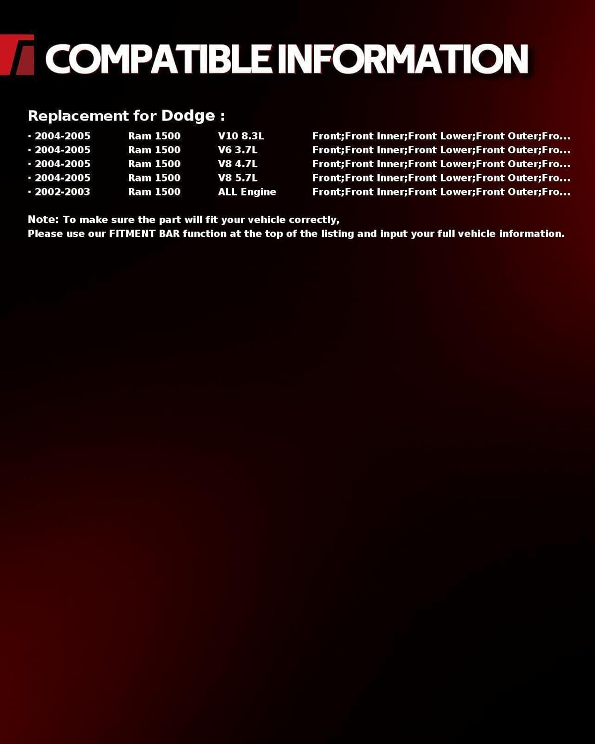 • Compatible List: R-a-m 1500 2002-2005. NOTE: Please check with the "Amazon Confirmed Fit" or the detailed fitment info in the production description below to make sure that is the correct part for your vehicle