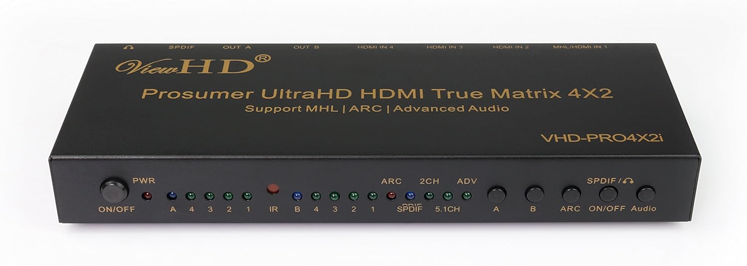 Prosumer grade UltraHD 4K @30Hz HDMI true matrix 6x2 from ViewHD, any input to any output. This advanced multi-functional and versatile HDMI matrix was designed for home/business theater surround sound entertainment application. The 6x2 HDMI Matrix supports the feature of ARC "Audio Return Channel", 4K / Ultra HD (HDMI v1.4: 4096x2160@24fps or 3820x2160@30fps) and 3D, as well as HDMI audio extraction for SPDIF/Toslink and an integrated stereo Digital to Analog audio converter. Audio Extraction supports either output A or B for whatever inputs selected for output A or output B. To select the desired output (A/B) for audio extraction, use the "A-B" button on the remote; there is a blue LED indicator light on the front panel of the matrix labeled by "A-B", when output A is selected, this blue LED light is off; when output B is selected, the blue LED light is on. The 3.5mm headphone output supports incoming HDMI audio format of 2CH PCM stereo audio format; the 3.5mm headphone output will not work if the incoming HDMI audio format is higher than 2CH PCM. The SPDIF audio extractor and the built-in digital stereo to analog converter are always on, as long as the incoming audio format is supported by them. Additional Features: 1) SPDIF audio output port supports digital audio formats upto Dolby digital 5.1CH (AC3), DTS 5.1CH and Dolby Digital Plus. 2) Support PIP function: have one main picture and up to five small pictures covering all active HDMI inputs 3) Support IR remote control and front panel push button operating control 4) LED Status Lights display the input selections and settings of the matrix 5) Power-off memory 6) Comes with DC5V/2A (AC: 100V - 240V) universal power adapter Package Includes:1) HM6X2i main unit (205mm x 74mm x 26mm) 2) 5V2A Universal Power Adapter (100V-240V) with US plug 3) IR Remote Control 4) User Manual ViewHD One Year Warranty.