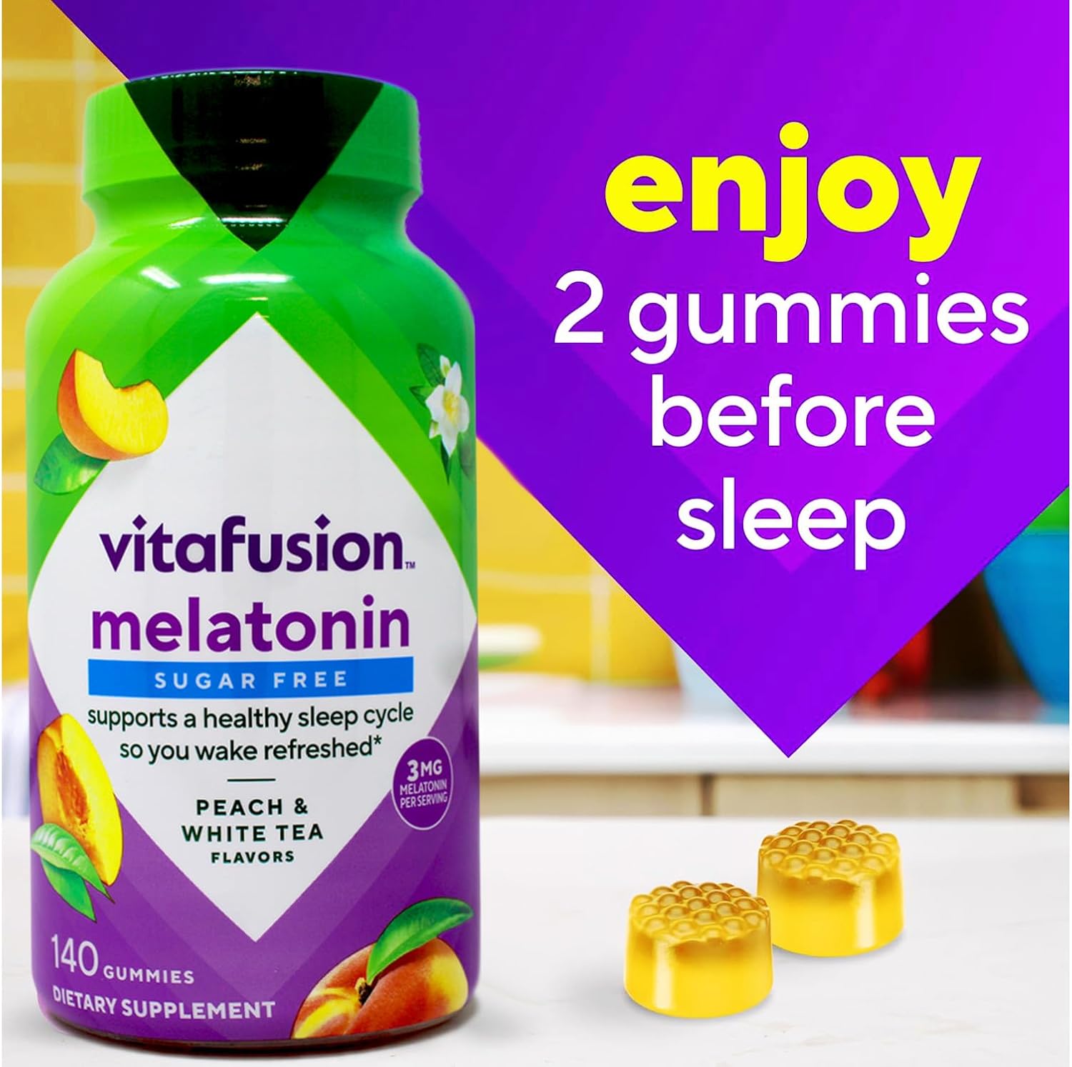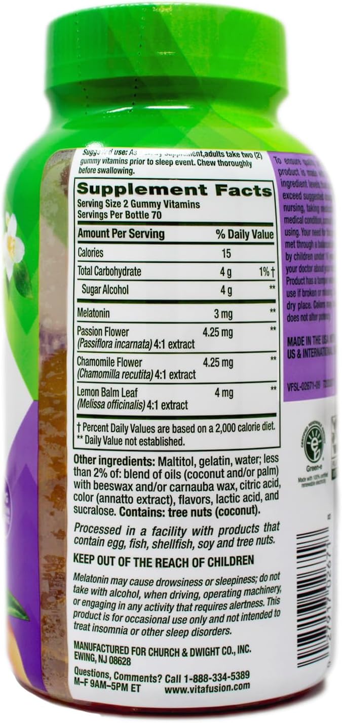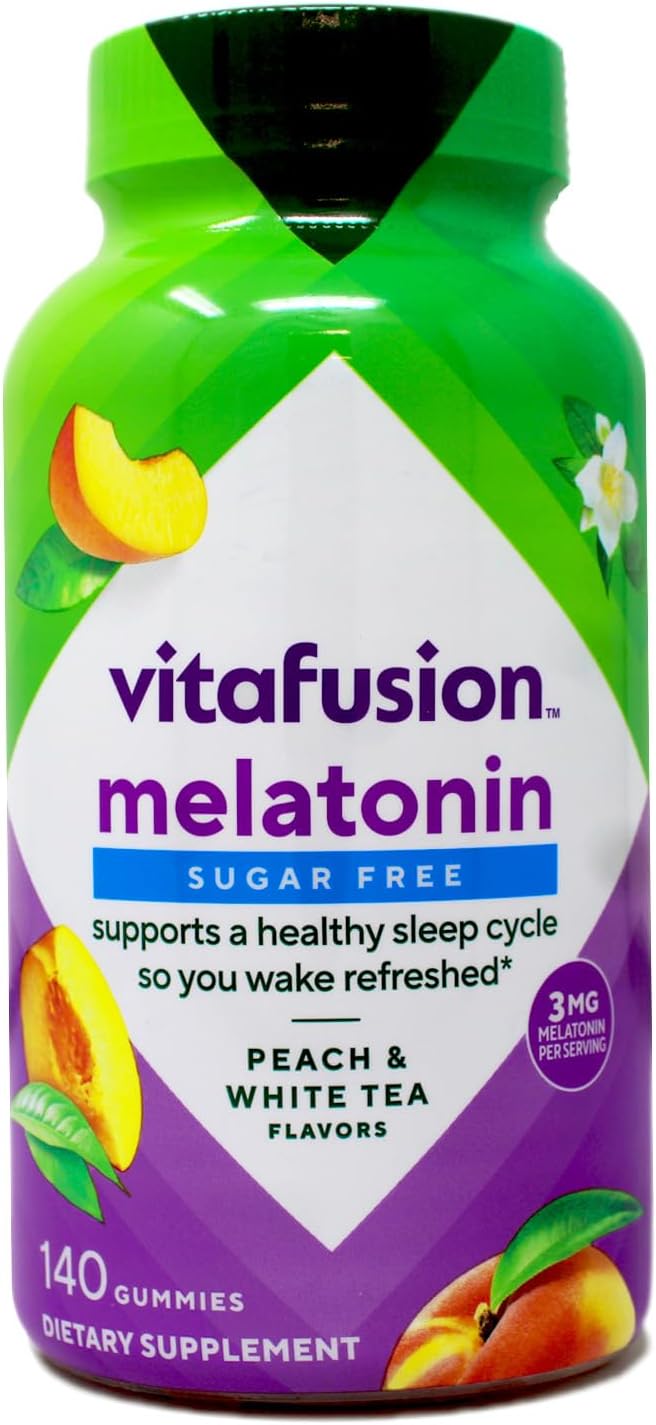 Vitafusion Melatonin is a sugar-free sleep support gummy with 3 mg of melatonin specifically formulated for adults. Melatonin plays a major role in regulating the sleep-wake cycle and supplementation of melatonin is used to help regulate this cycle and can assist with jet lag. At vitafusion, we believe taste and nutrition can be fused together to deliver the best vitamin experience, making it an easy and delicious part of your day. For over 12 years, we’ve been helping people live happy and healthy lives with our gummy vitamins and supplements. Anything is possible when great nutrition is your foundation. Take a fruitful step toward a healthier, happier world with America’s #1 gummy vitamin brand. One bottle of vitafusion Melatonin sleep aid gummies contains 140 gummy supplements for 70 nights of sleep support. Each two-gummy serving provides 3mg of Melatonin with natural white tea and peach flavors, a tasty alternative to hard-to-swallow pills. Melatonin supplements can help regulate your sleep cycle and aid in jet lag recovery. This dietary supplement is ideal for adults, specially formulated for sleep support so you can wake up feeling refreshed and rested. Vitafusion sugar-free melatonin gummies are made with no high-fructose corn syrup, no gluten, and no synthetic (FD&C) dyes.