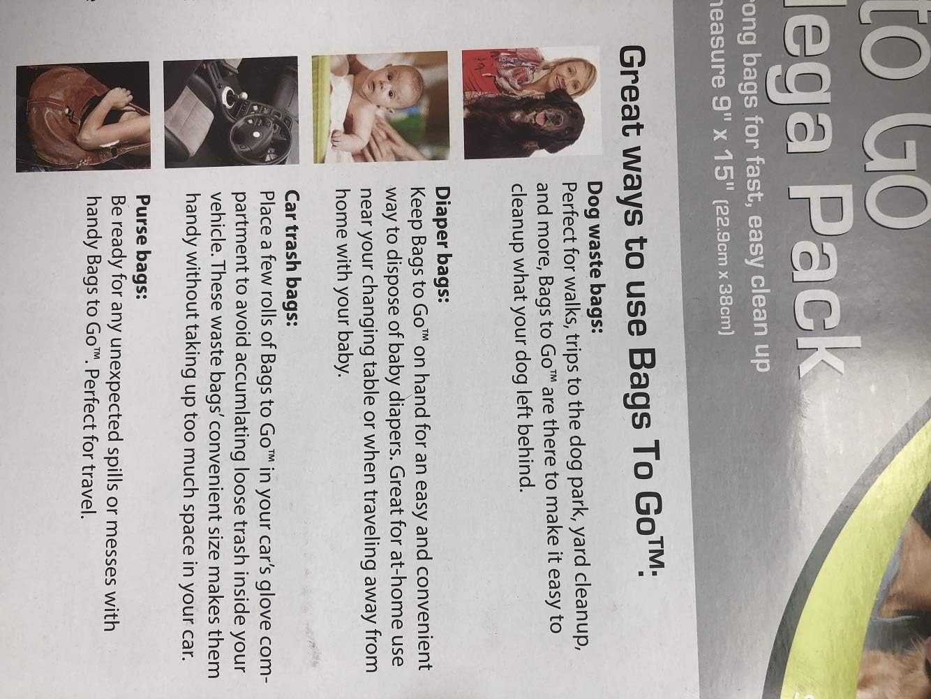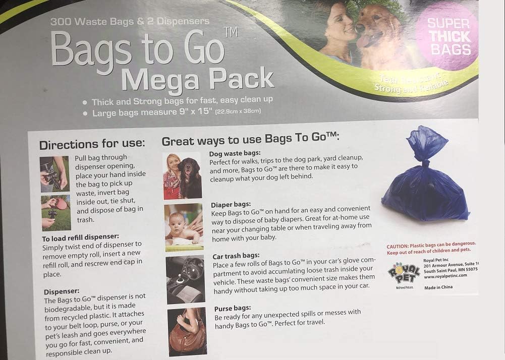 300 Waste bags & 2 Dispenser Thick and Strong Bags for fast, easy Clean up. These bags are tear resistance and strong and reliable. Some of teh intended use: Dog Waste Bag Diaper Bags Car Trash Bags Purse Bags 2 Dispenser is Included 300 Bags included Large Bags measure 9"* 15". Inclusded : 200 Waster Bags and 2 Dispensers