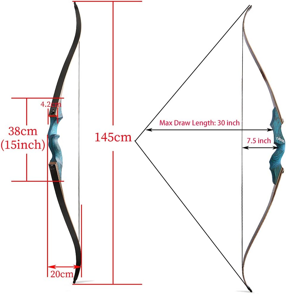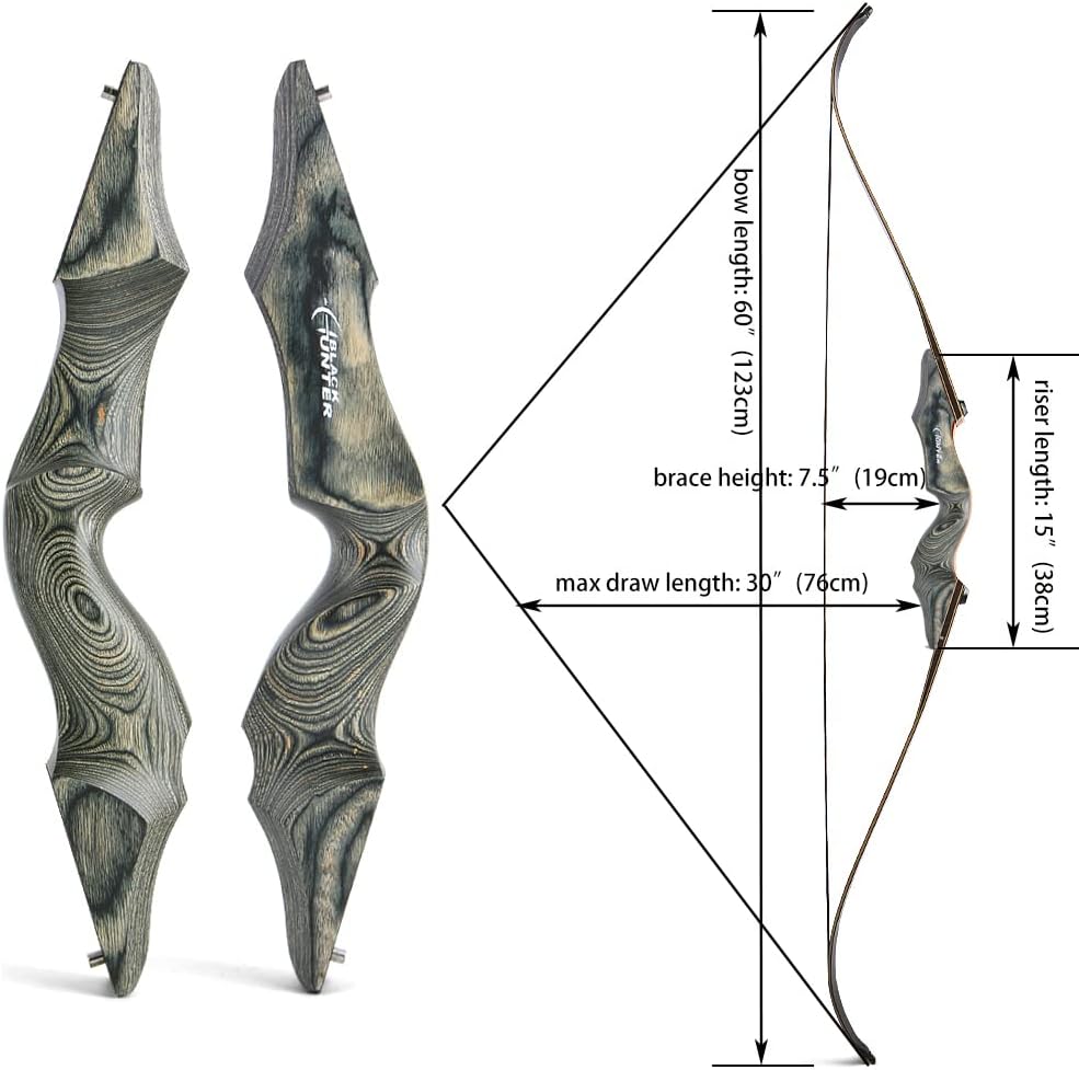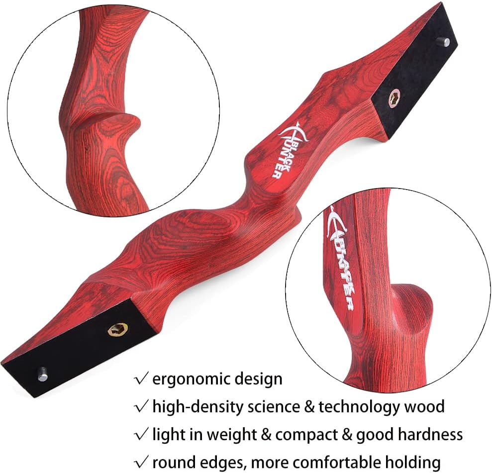 Specification Item Name: 60" takedown recurve bow Draw weight:20-60 lbs Bow length: 60inch Bowstring: 145cm/57inch (Dyneema string material ) Bow handle length: 15 inch Max draw length: 30 inch Brace height: 7.5 inch Bow riser material: High-density technical wood Bow limb material: fiberglass and bamboo core Bow Limb technology: Lamination Type:Takedown Net weight: about 1kg Package: 1 x Recurve Bow Only 1 x bow stringer1 x arm guard 1 x finger guard 1 x bowstring wax 1 x arrow rest Features: 1.Lamination technology, offer the best toughness and power for the bow 2. Ergonomically designed with Impressive rounded edges and a fine finished wooden handle, Extremely Comfortable Grip 3. Great appearance and stable performance 4. 20-60lbs Draw Weight, perfect for the beginner and the experienced archers. 5. Black Hunter Original Recurve Bow, quality assurance; American Hunting Bow, designed for the Archery Outdoor Hunting, Target Shooting Practice, Training Warm notice: 1.The bow is delivered with riser / limbs / string. You need to assemble them by yourself after you received them. 2.This bow isn’t a toy, please never shoot at a person, it’s dangerous.